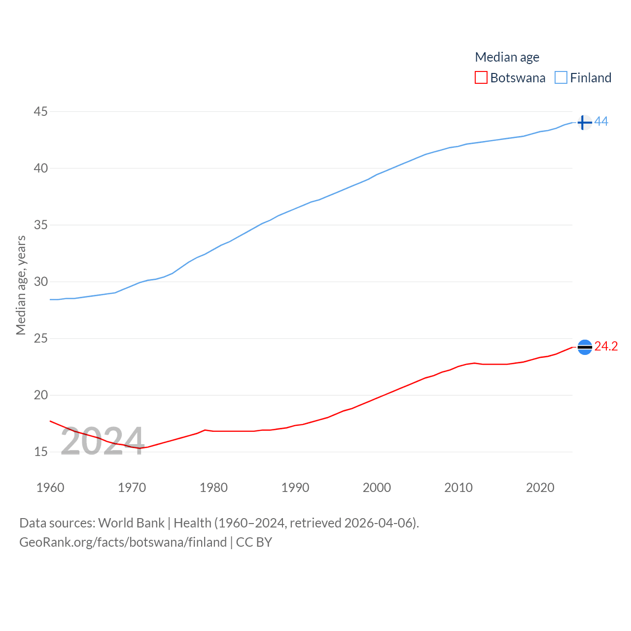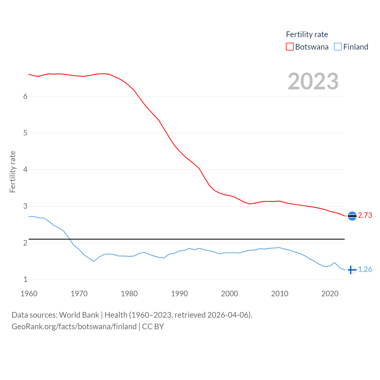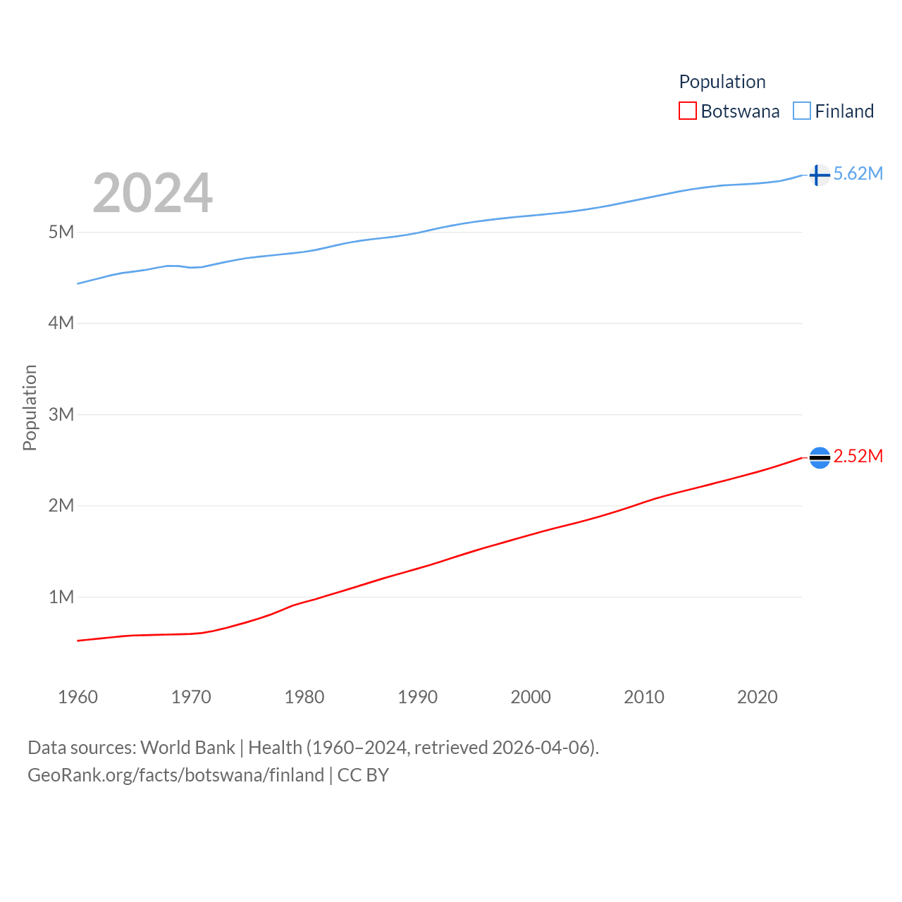 Botswana has a population of 2.52M (ranked 142/197), compared with 5.62M in Finland (ranked 116/197). Botswana's land area is 218,816 sq mi versus 117,360 sq mi for Finland (ranked 47th vs. 70th).