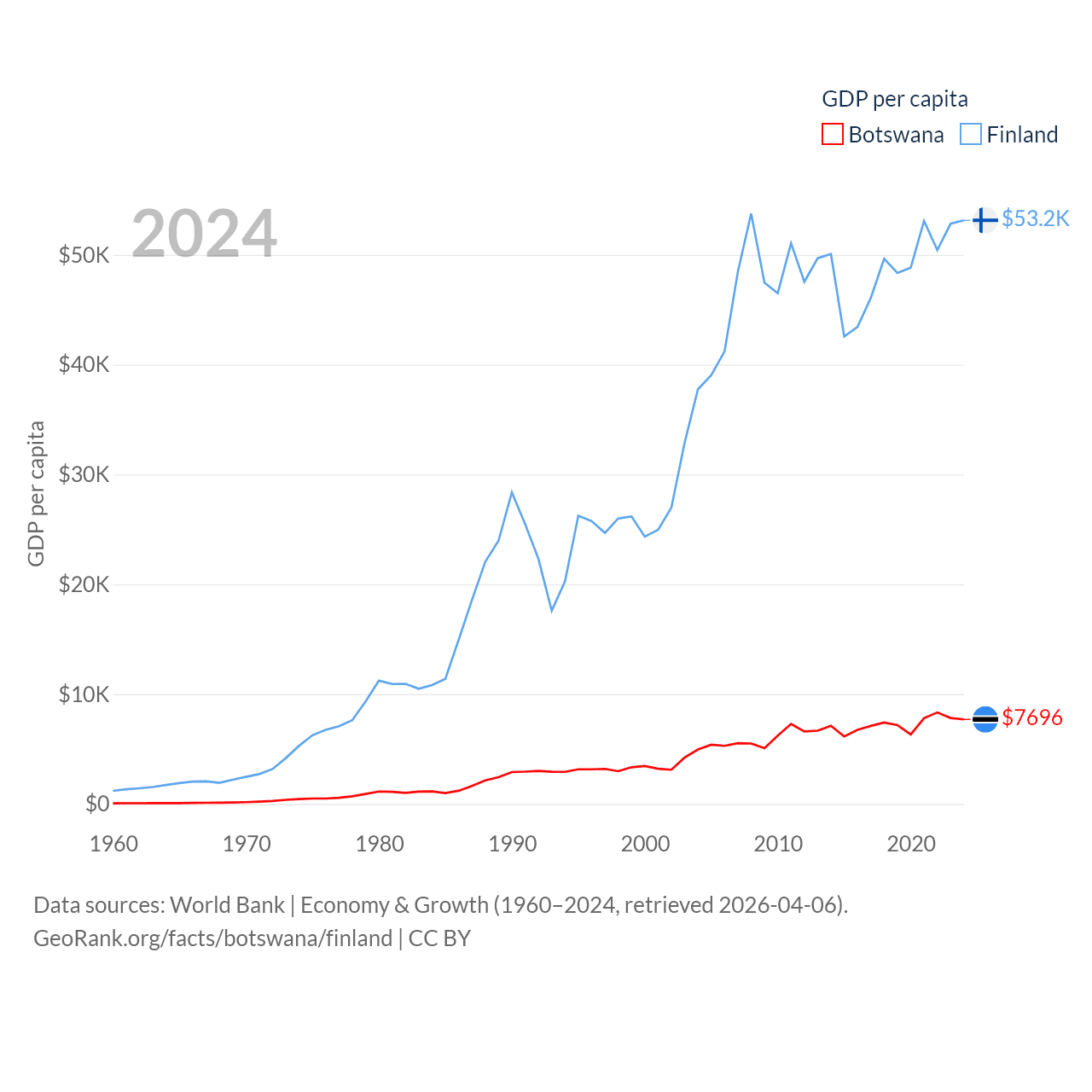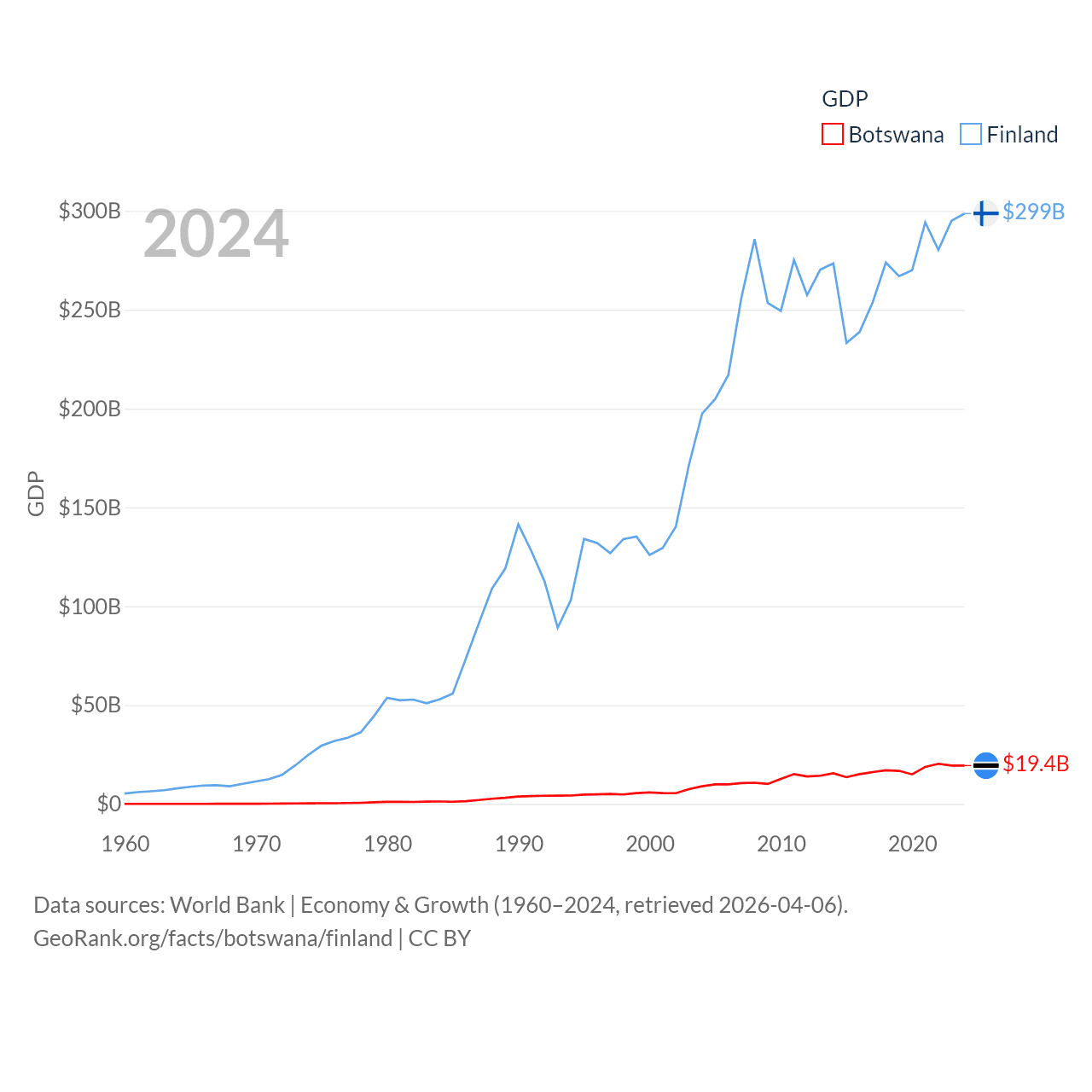 By GDP, Botswana ranks 133/197 ($19.4B) and Finland ranks 47/197 ($299B). By GDP per capita, Botswana ranks 97/197 ($7,696), while Finland ranks 23/197 ($53,150).