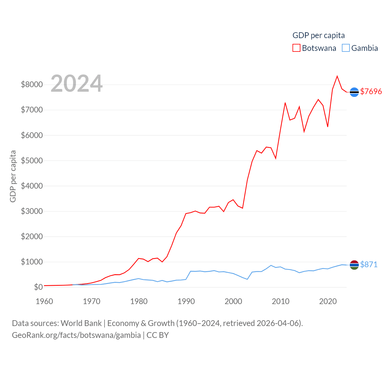 By GDP, Botswana ranks 133/197 ($19.4B) and The Gambia ranks 174/197 ($2.4B). By GDP per capita, Botswana ranks 97/197 ($7,696), while The Gambia ranks 183/197 ($871).