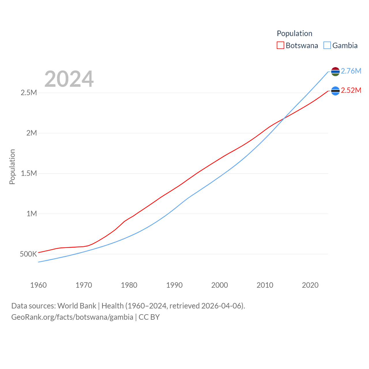 Botswana has a population of 2.52M (ranked 142/197), compared with 2.76M in The Gambia (ranked 140/197). Botswana's land area is 218,816 sq mi versus 3,907 sq mi for The Gambia (ranked 47th vs. 161st).