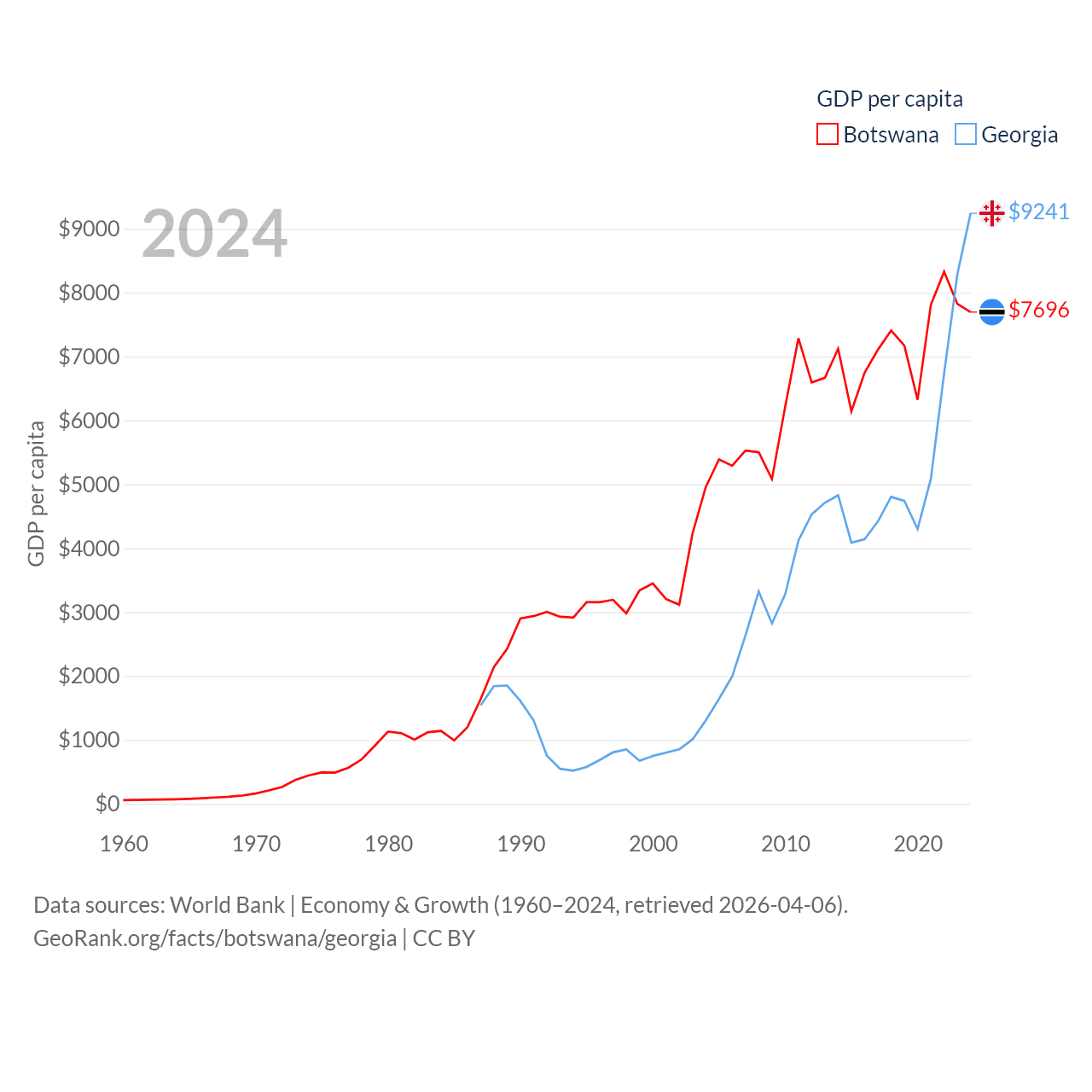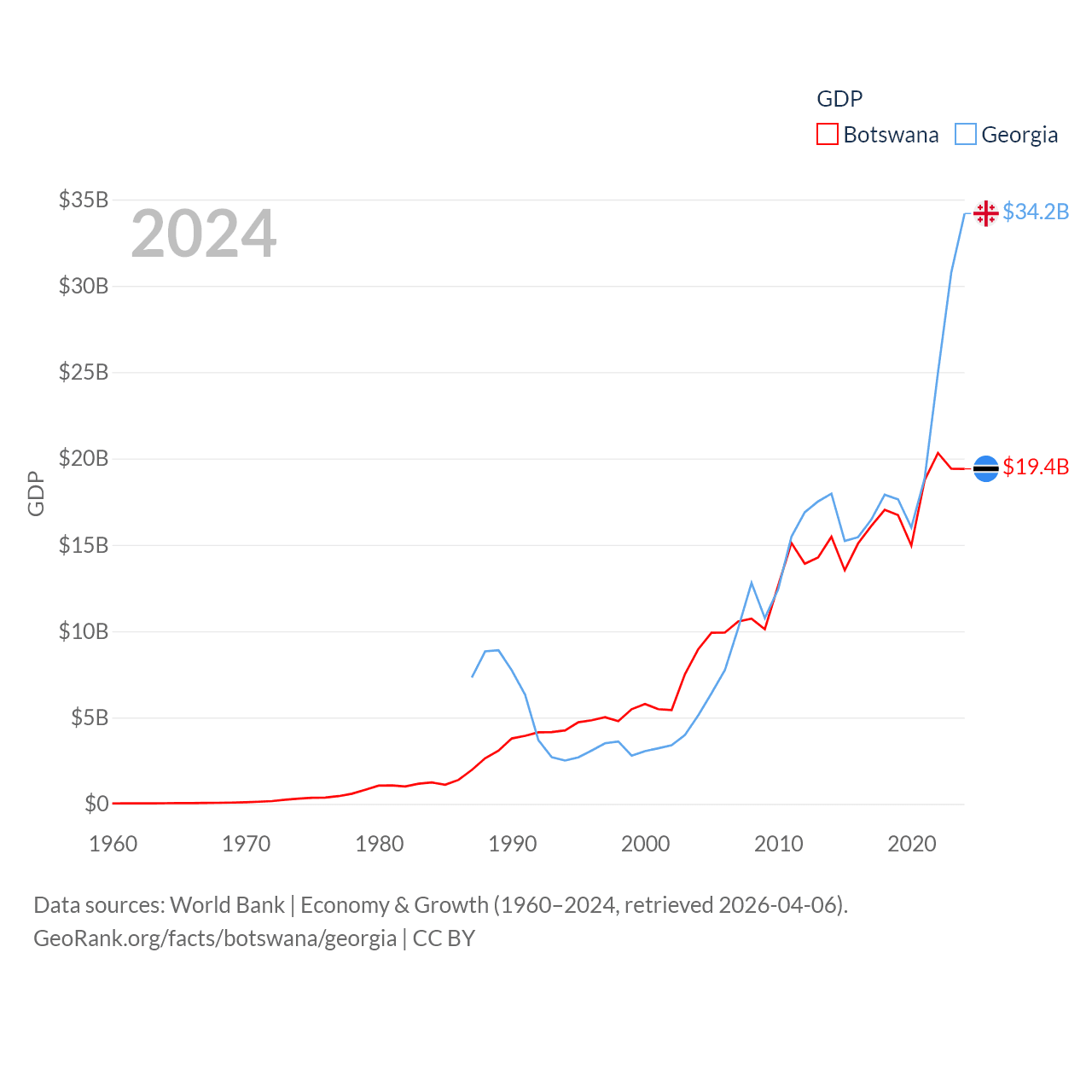 By GDP, Botswana ranks 133/197 ($19.4B) and Georgia ranks 107/197 ($34.2B). By GDP per capita, Botswana ranks 97/197 ($7,696), while Georgia ranks 89/197 ($9,241).