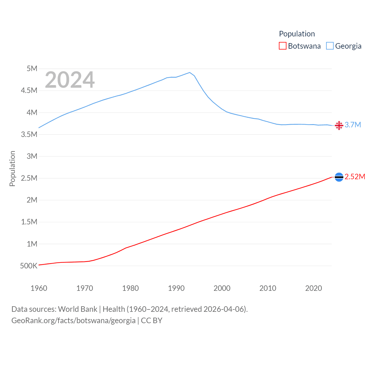 Botswana has a population of 2.52M (ranked 142/197), compared with 3.7M in Georgia (ranked 130/197). Botswana's land area is 218,816 sq mi versus 26,830 sq mi for Georgia (ranked 47th vs. 118th).