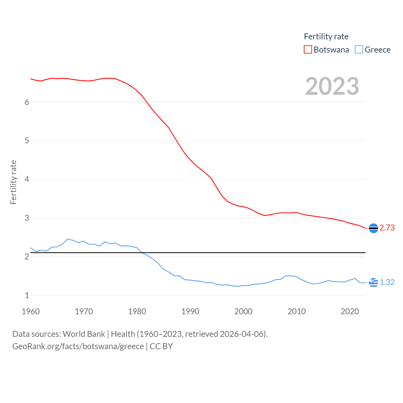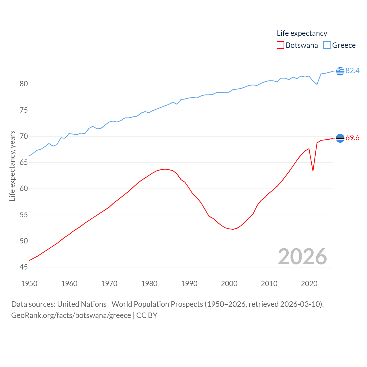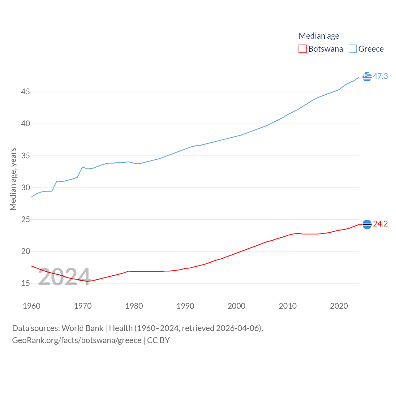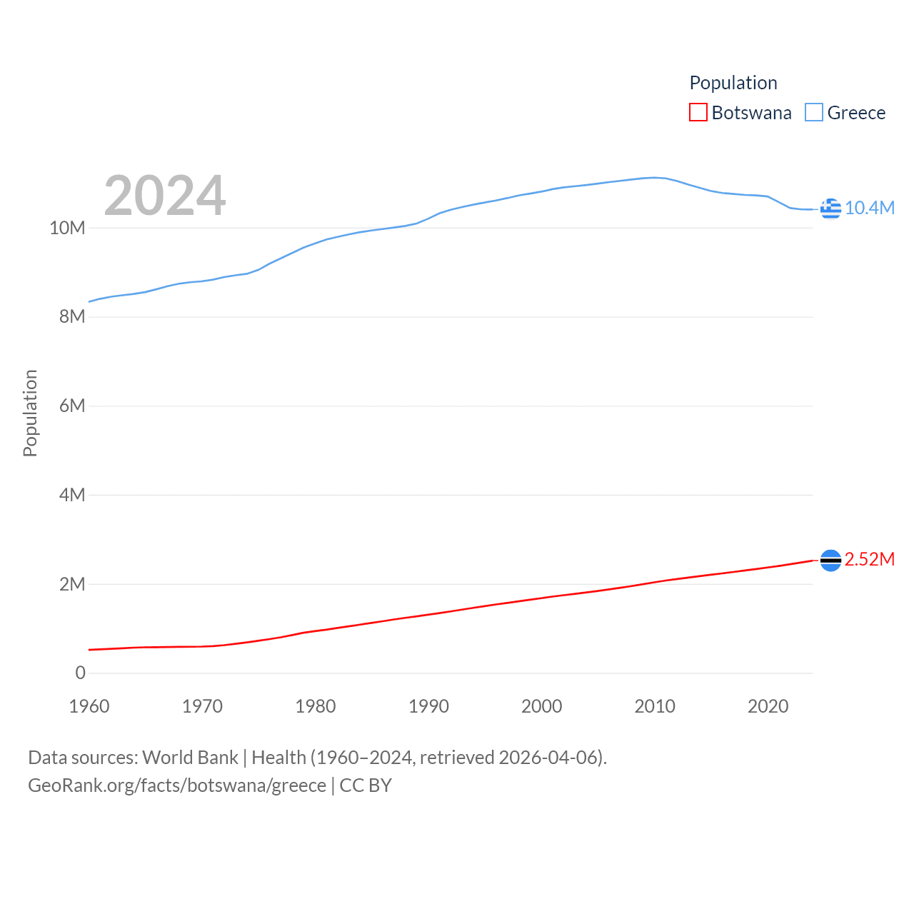 Botswana has a population of 2.52M (ranked 142/197), compared with 10.4M in Greece (ranked 94/197). Botswana's land area is 218,816 sq mi versus 49,769 sq mi for Greece (ranked 47th vs. 95th).