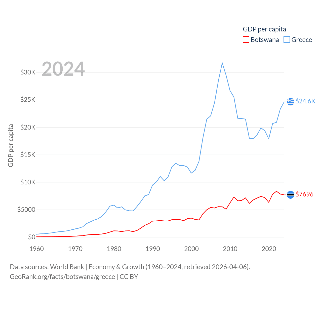 By GDP, Botswana ranks 133/197 ($19.4B) and Greece ranks 53/197 ($256B). By GDP per capita, Botswana ranks 97/197 ($7,696), while Greece ranks 49/197 ($24,626).