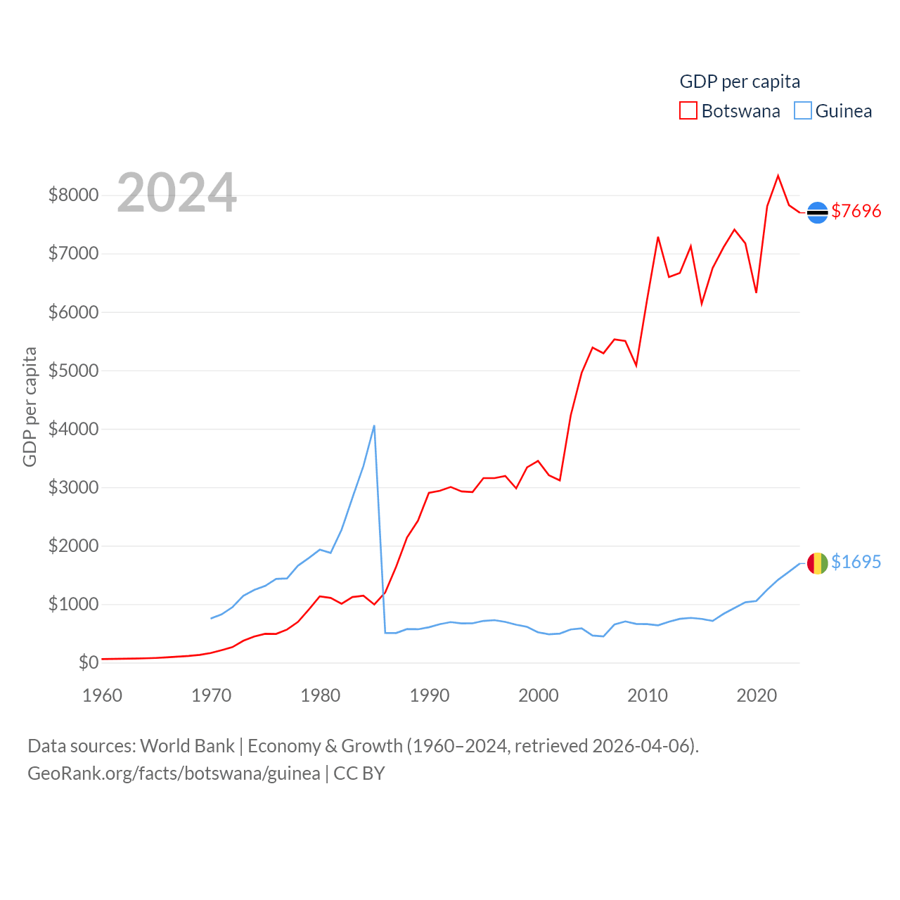 By GDP, Botswana ranks 133/197 ($19.4B) and Guinea ranks 118/197 ($25B). By GDP per capita, Botswana ranks 97/197 ($7,696), while Guinea ranks 160/197 ($1,695).