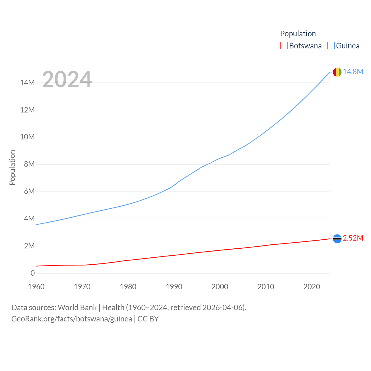 Botswana has a population of 2.52M (ranked 142/197), compared with 14.8M in Guinea (ranked 75/197). Botswana's land area is 218,816 sq mi versus 94,873 sq mi for Guinea (ranked 47th vs. 77th).