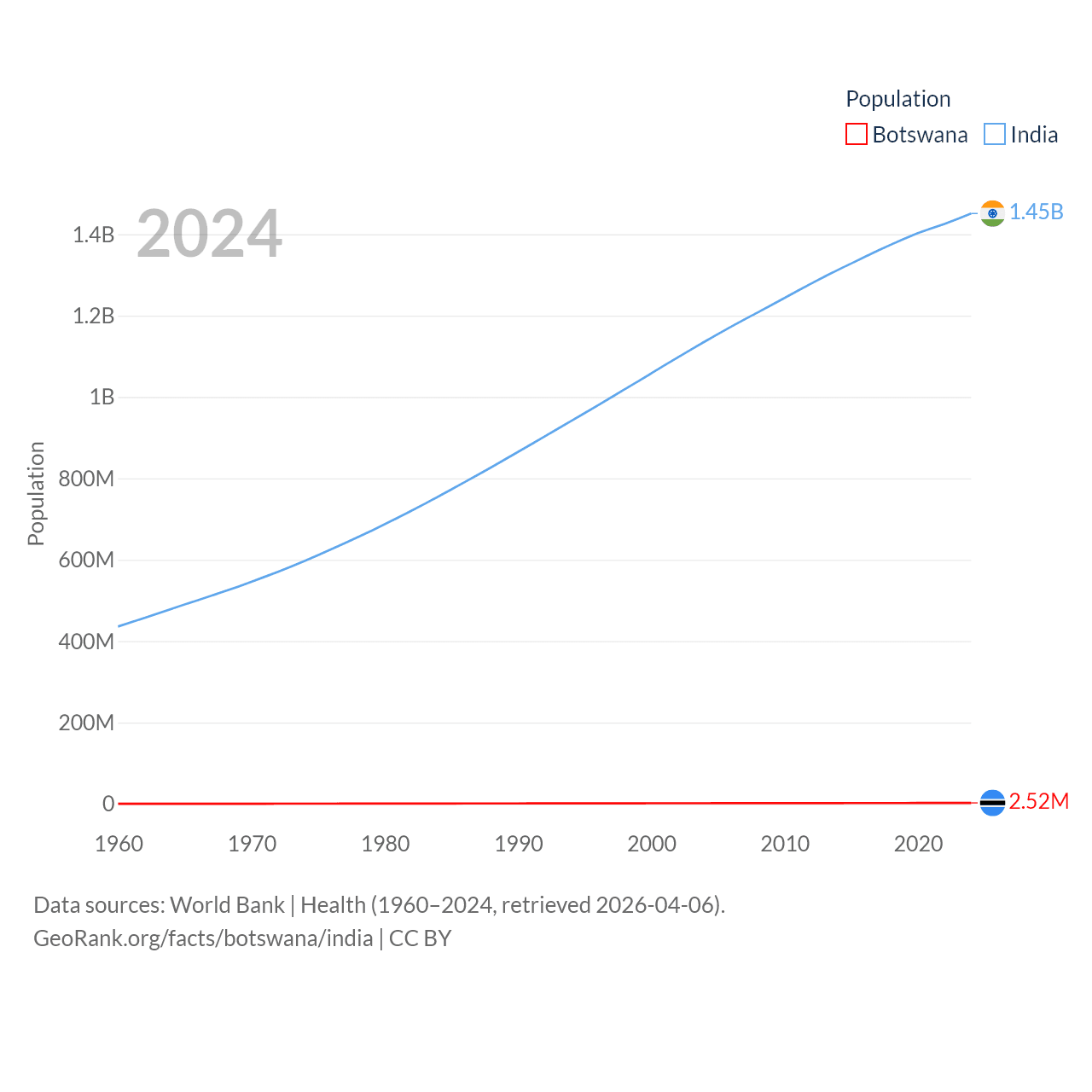Botswana has a population of 2.52M (ranked 142/197), compared with 1.45B in India (ranked 1/197). Botswana's land area is 218,816 sq mi versus 1,147,955 sq mi for India (ranked 47th vs. 7th).