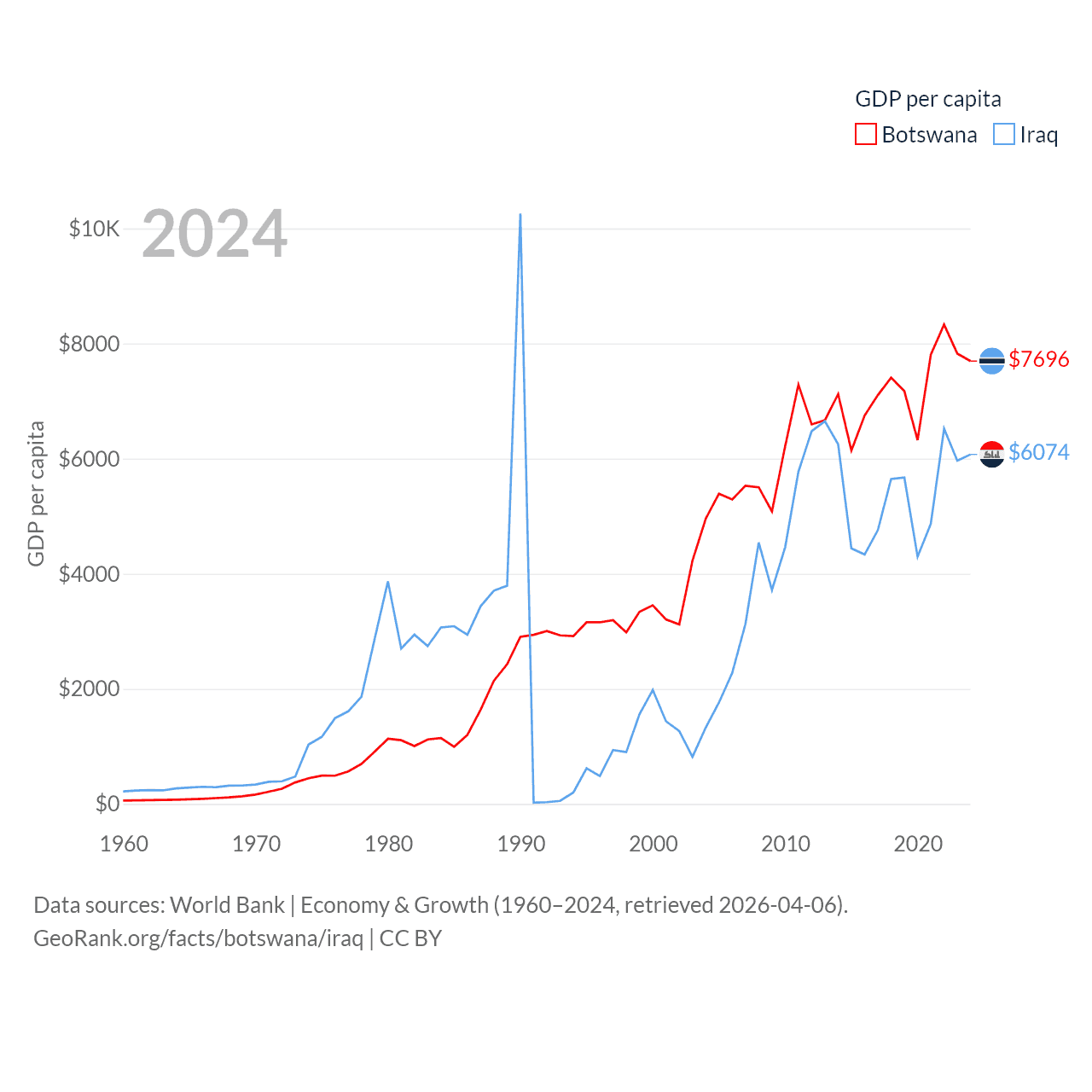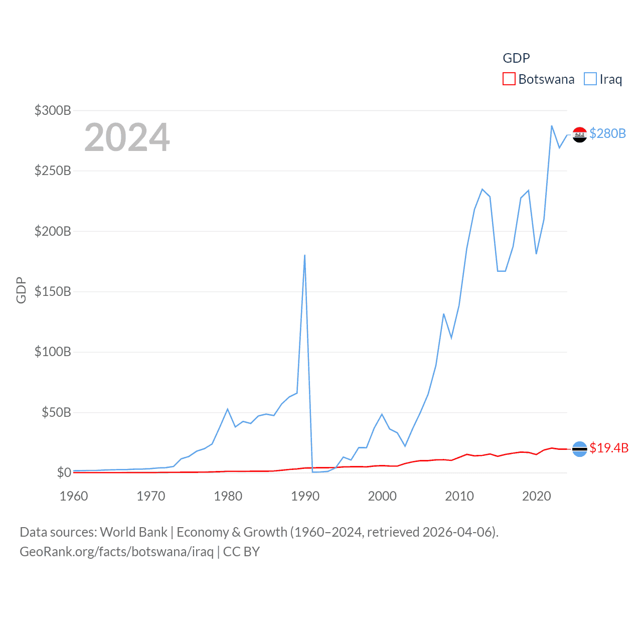 By GDP, Botswana ranks 133/197 ($19.4B) and Iraq ranks 50/197 ($280B). By GDP per capita, Botswana ranks 97/197 ($7,696), while Iraq ranks 113/197 ($6,074).