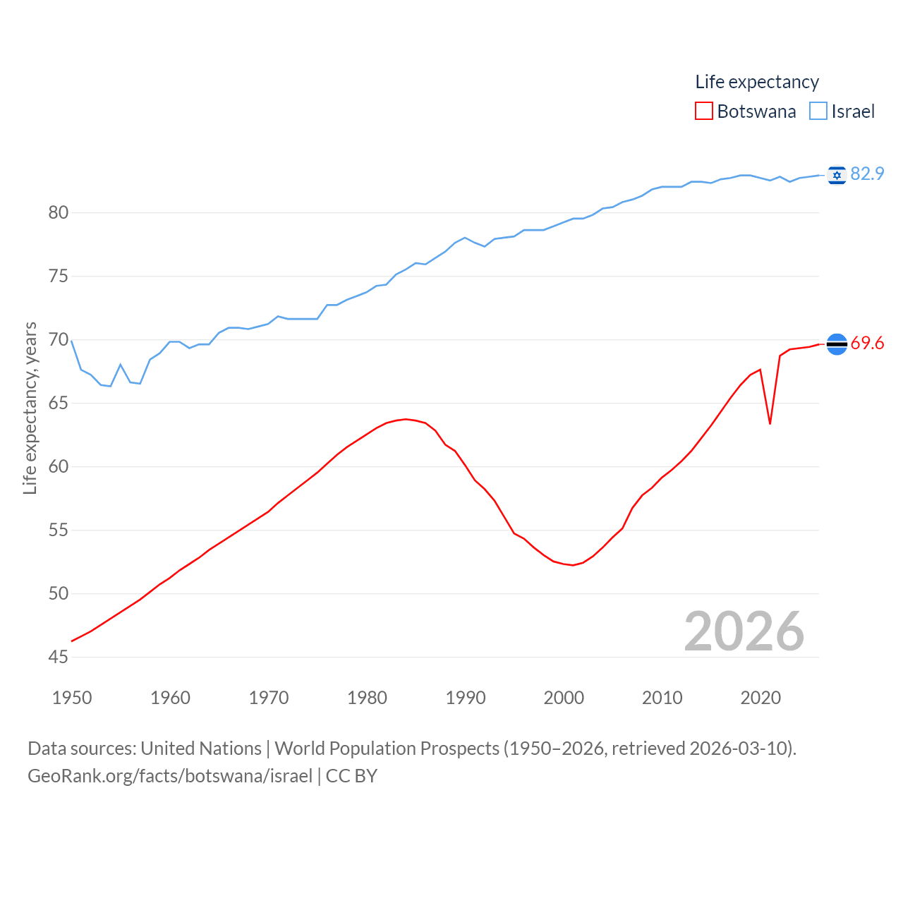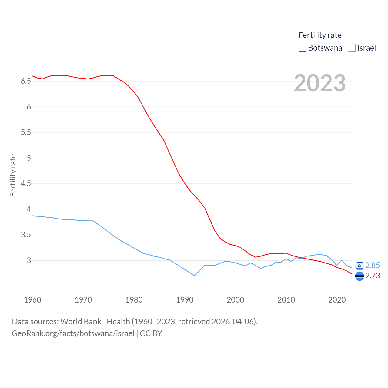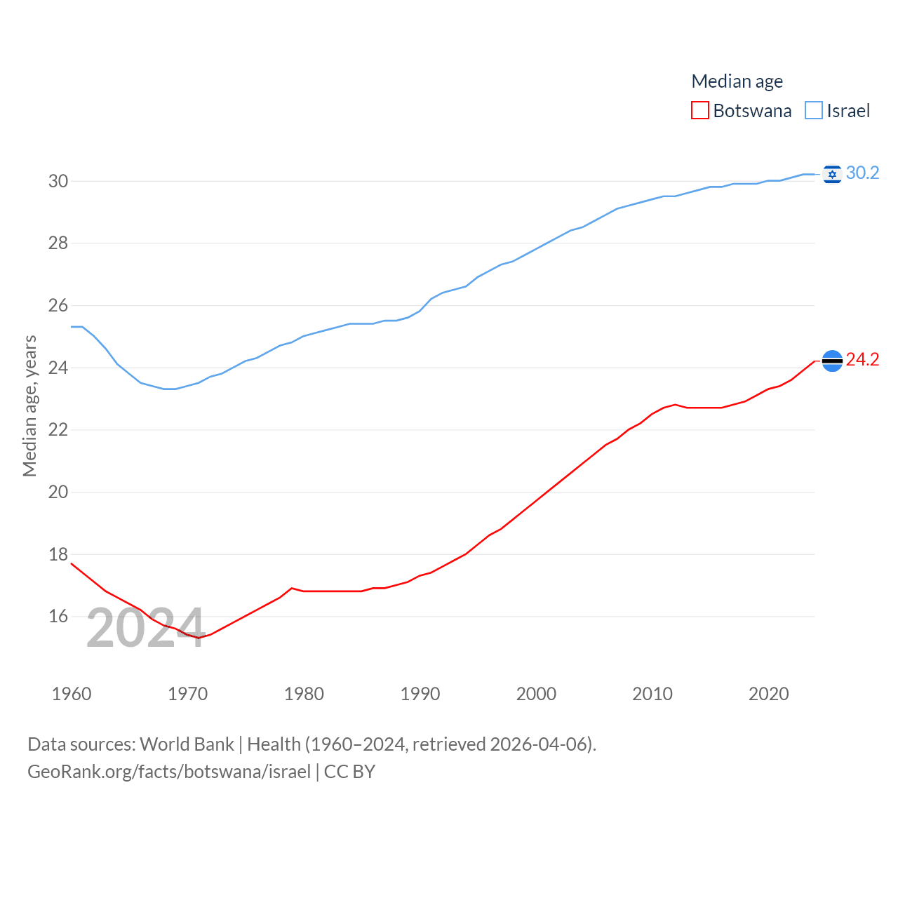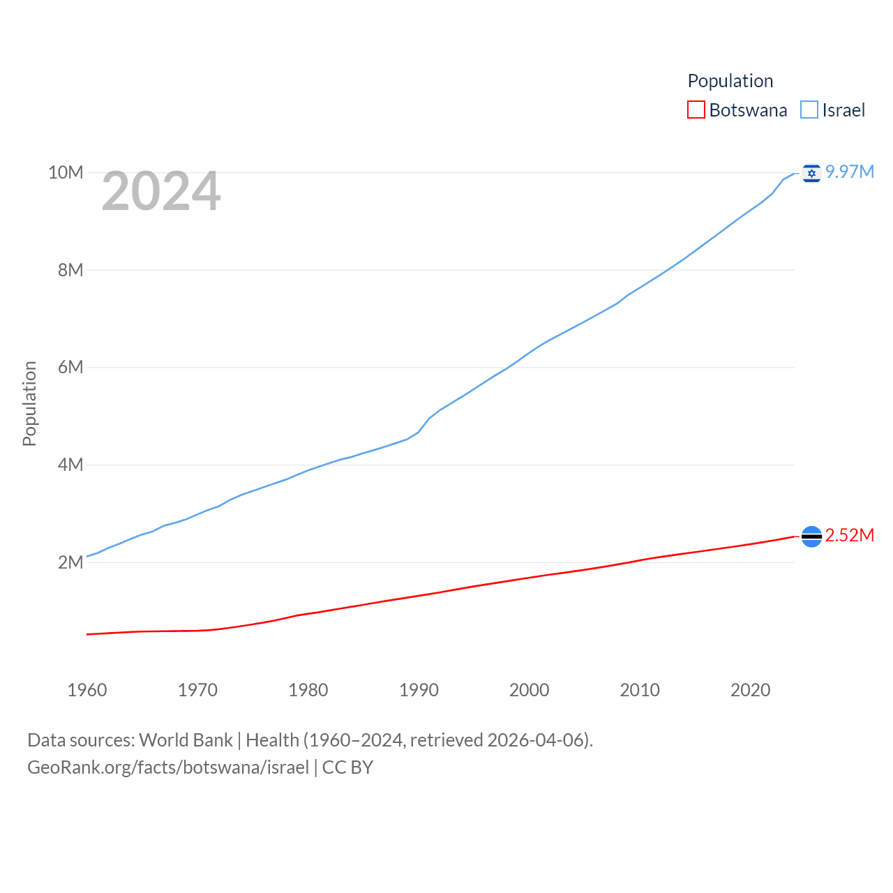 Botswana has a population of 2.52M (ranked 142/197), compared with 9.97M in Israel (ranked 96/197). Botswana's land area is 218,816 sq mi versus 8,355 sq mi for Israel (ranked 47th vs. 149th).