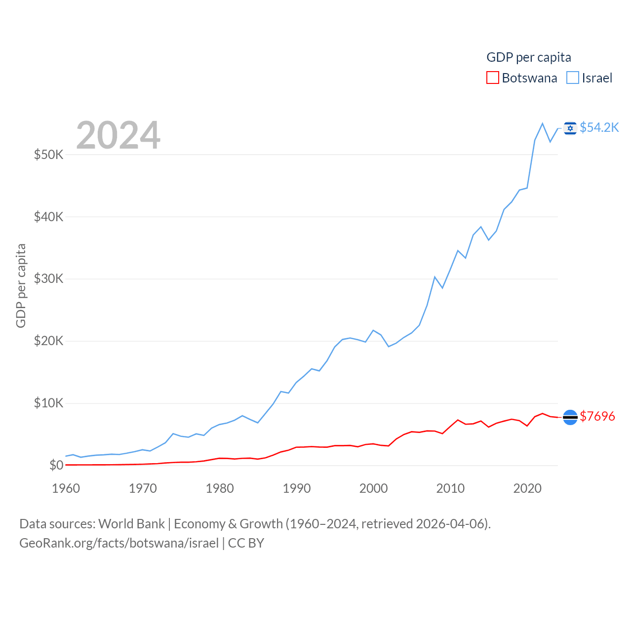 By GDP, Botswana ranks 133/197 ($19.4B) and Israel ranks 29/197 ($540B). By GDP per capita, Botswana ranks 97/197 ($7,696), while Israel ranks 21/197 ($54,177).