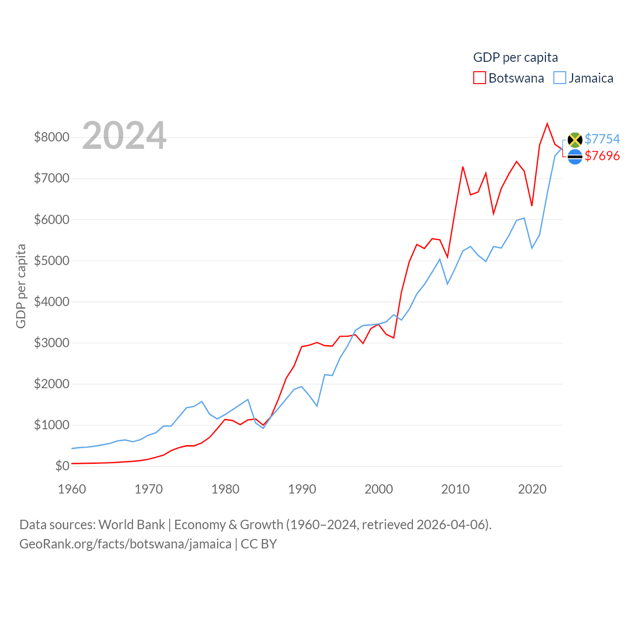 By GDP, Botswana ranks 133/197 ($19.4B) and Jamaica ranks 124/197 ($22B). By GDP per capita, Botswana ranks 97/197 ($7,696), while Jamaica ranks 95/197 ($7,754).