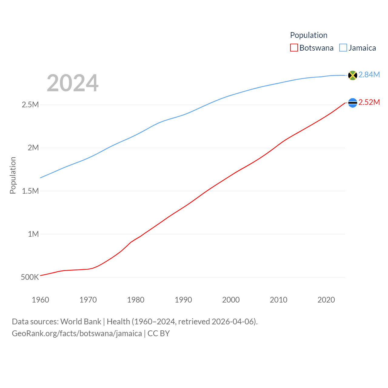 Botswana has a population of 2.52M (ranked 142/197), compared with 2.84M in Jamaica (ranked 139/197). Botswana's land area is 218,816 sq mi versus 4,181 sq mi for Jamaica (ranked 47th vs. 159th).