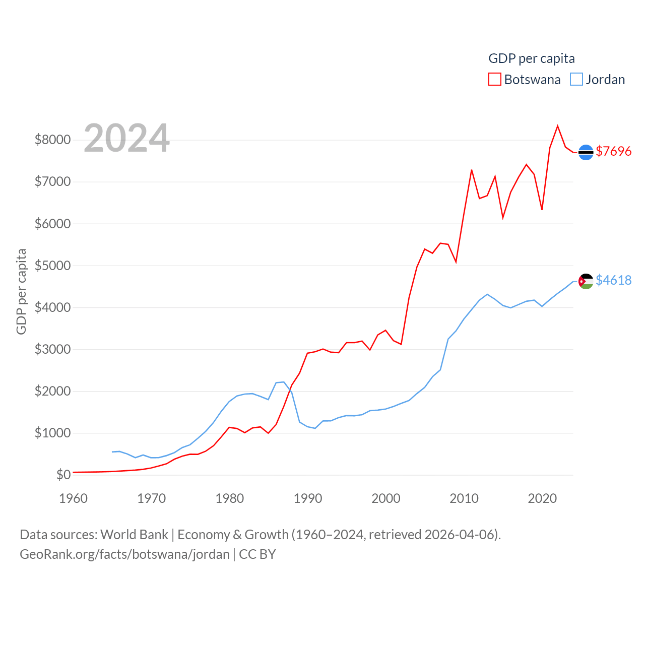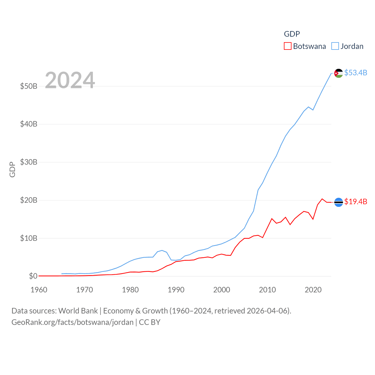 By GDP, Botswana ranks 133/197 ($19.4B) and Jordan ranks 90/197 ($53.4B). By GDP per capita, Botswana ranks 97/197 ($7,696), while Jordan ranks 123/197 ($4,618).