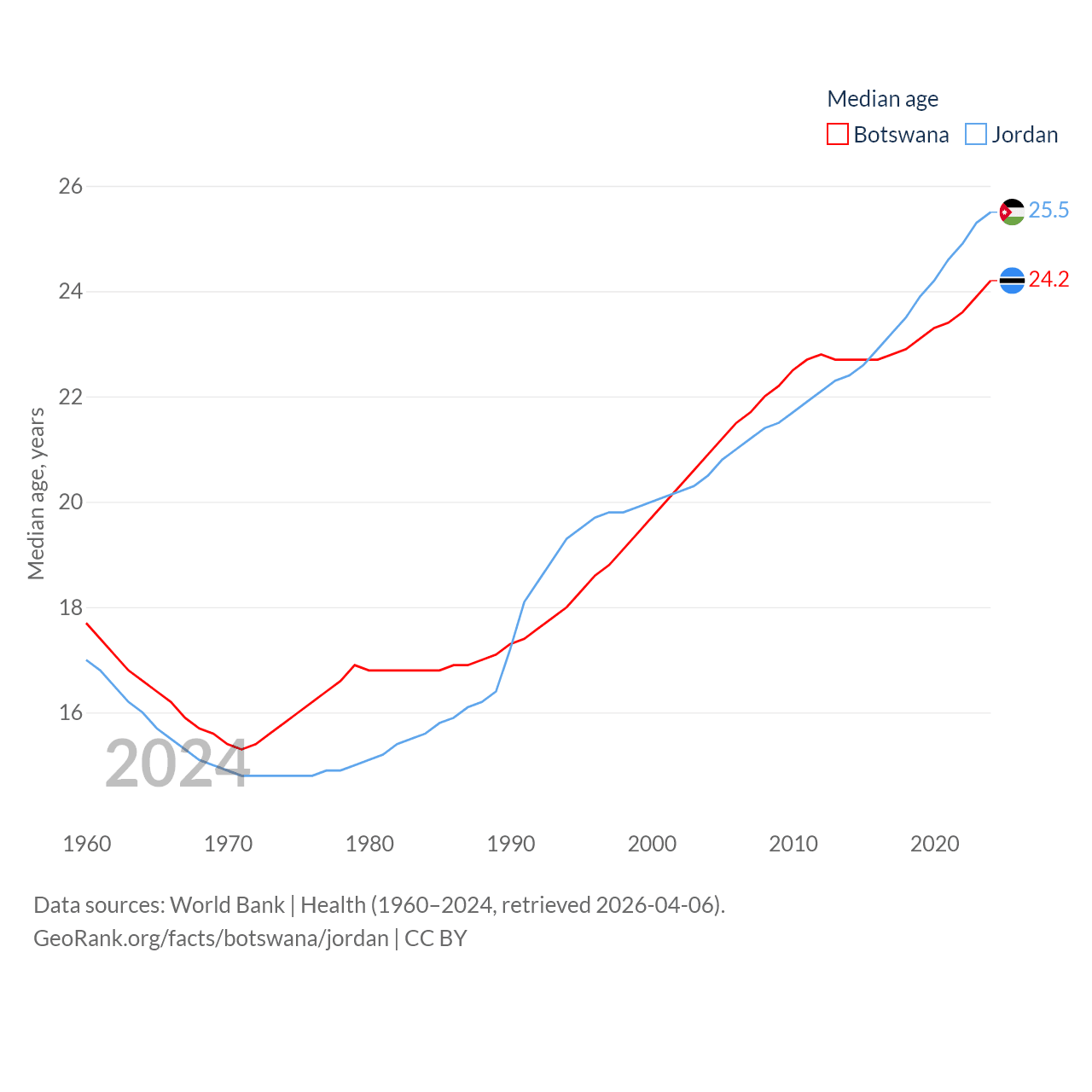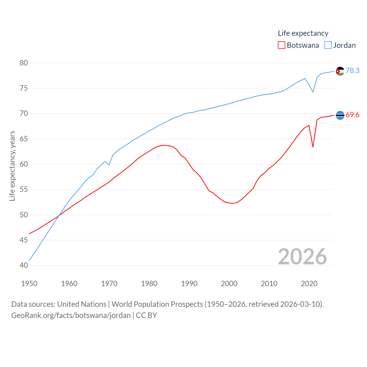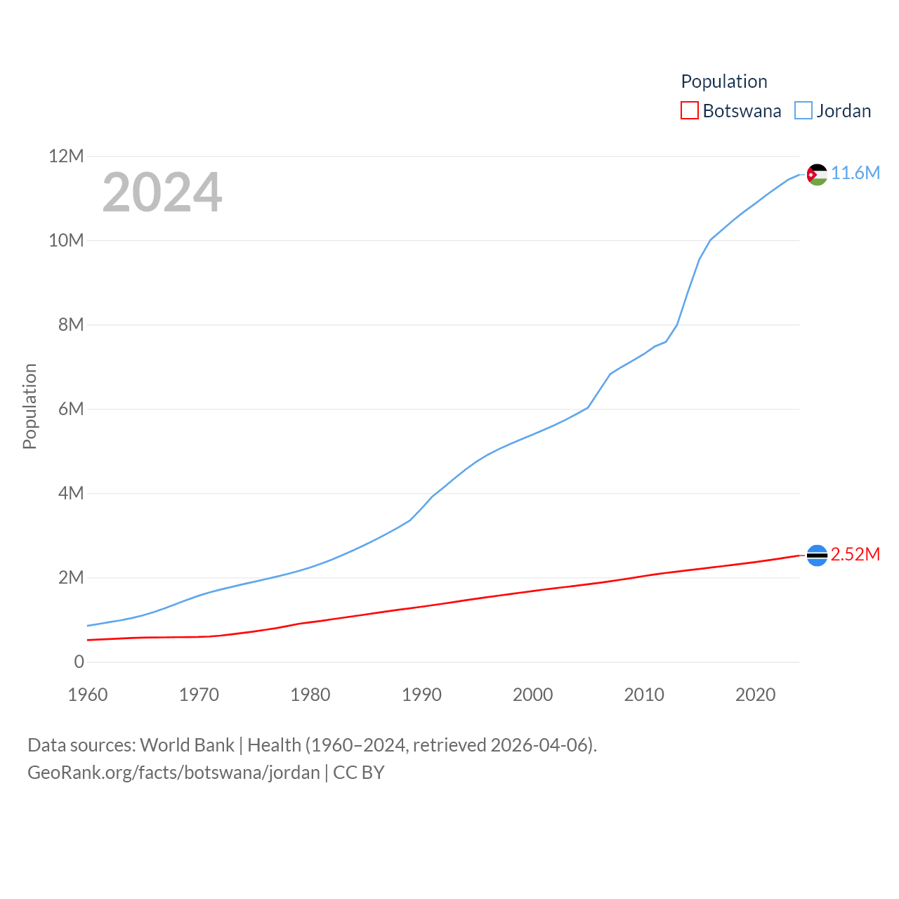 Botswana has a population of 2.52M (ranked 142/197), compared with 11.6M in Jordan (ranked 84/197). Botswana's land area is 218,816 sq mi versus 34,284 sq mi for Jordan (ranked 47th vs. 110th).