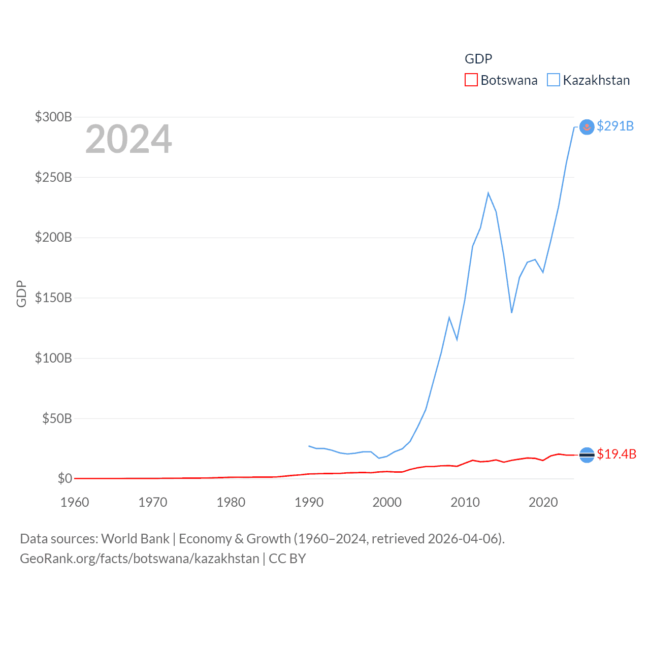 By GDP, Botswana ranks 133/197 ($19.4B) and Kazakhstan ranks 48/197 ($291B). By GDP per capita, Botswana ranks 97/197 ($7,696), while Kazakhstan ranks 71/197 ($14,155).