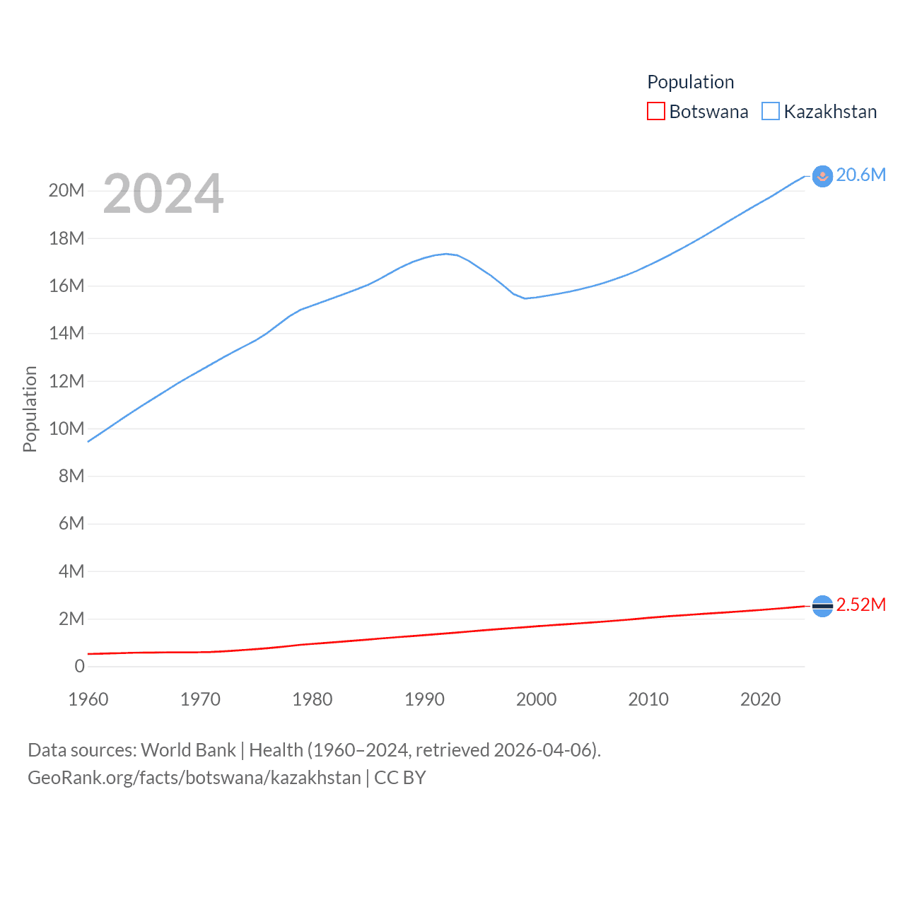 Botswana has a population of 2.52M (ranked 142/197), compared with 20.6M in Kazakhstan (ranked 64/197). Botswana's land area is 218,816 sq mi versus 1,042,360 sq mi for Kazakhstan (ranked 47th vs. 9th).