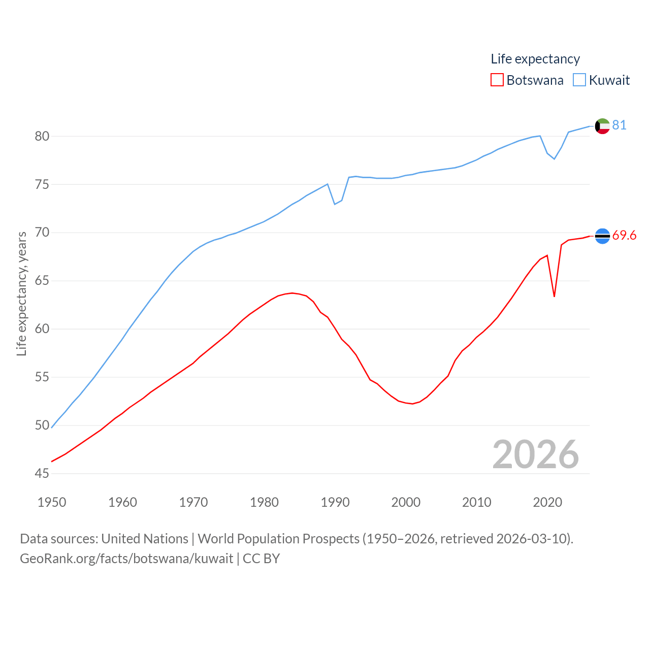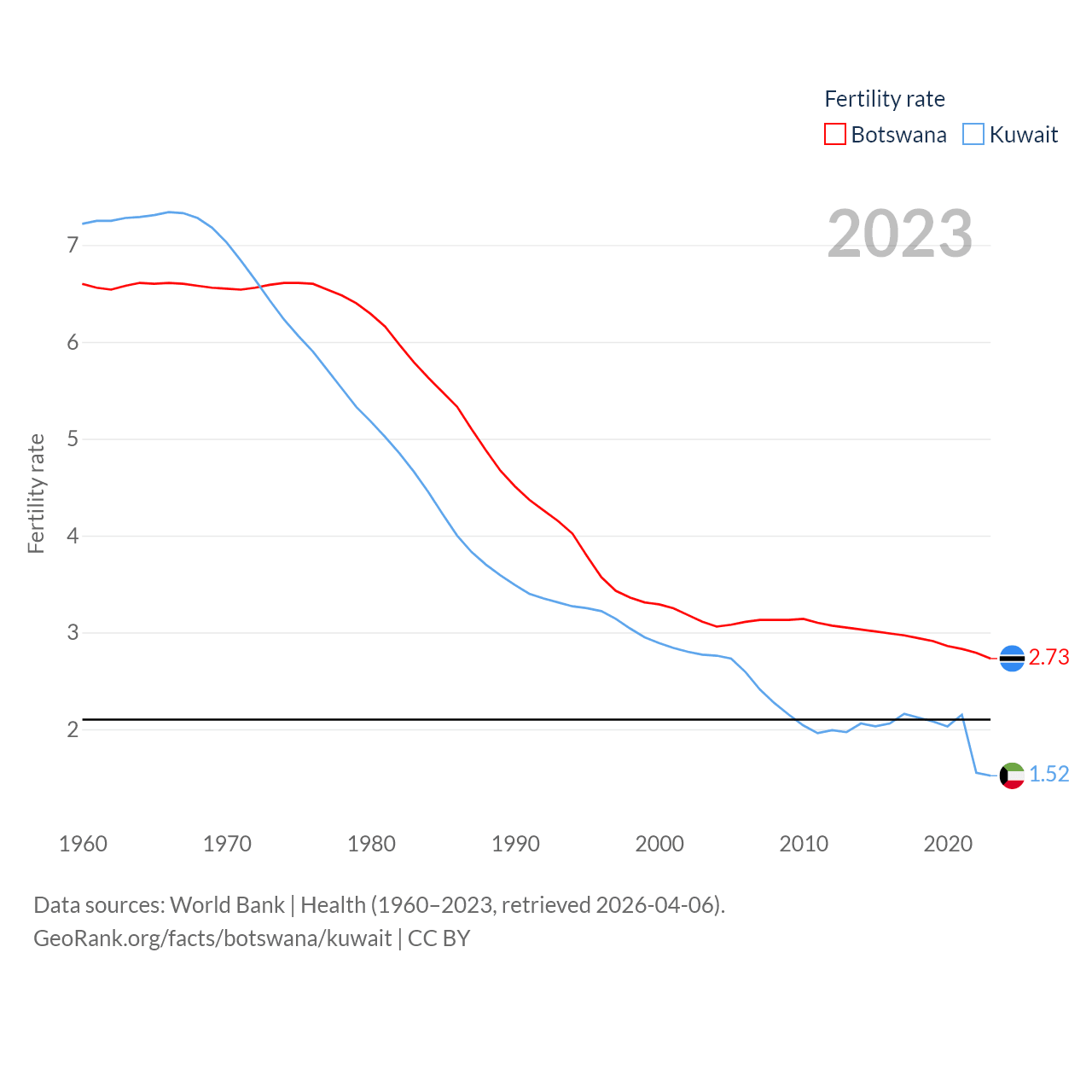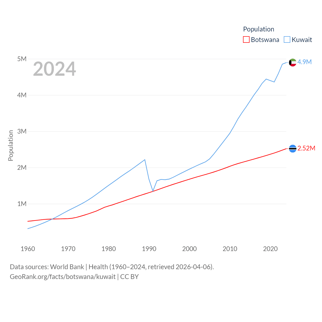 Botswana has a population of 2.52M (ranked 142/197), compared with 4.9M in Kuwait (ranked 127/197). Botswana's land area is 218,816 sq mi versus 6,880 sq mi for Kuwait (ranked 47th vs. 153rd).