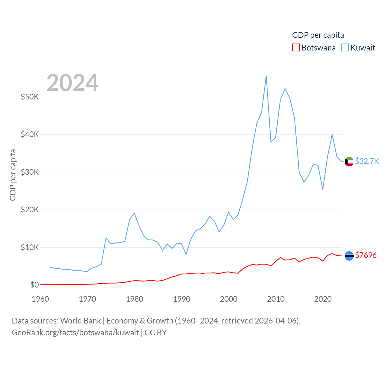 By GDP, Botswana ranks 133/197 ($19.4B) and Kuwait ranks 59/197 ($160B). By GDP per capita, Botswana ranks 97/197 ($7,696), while Kuwait ranks 37/197 ($32,718).