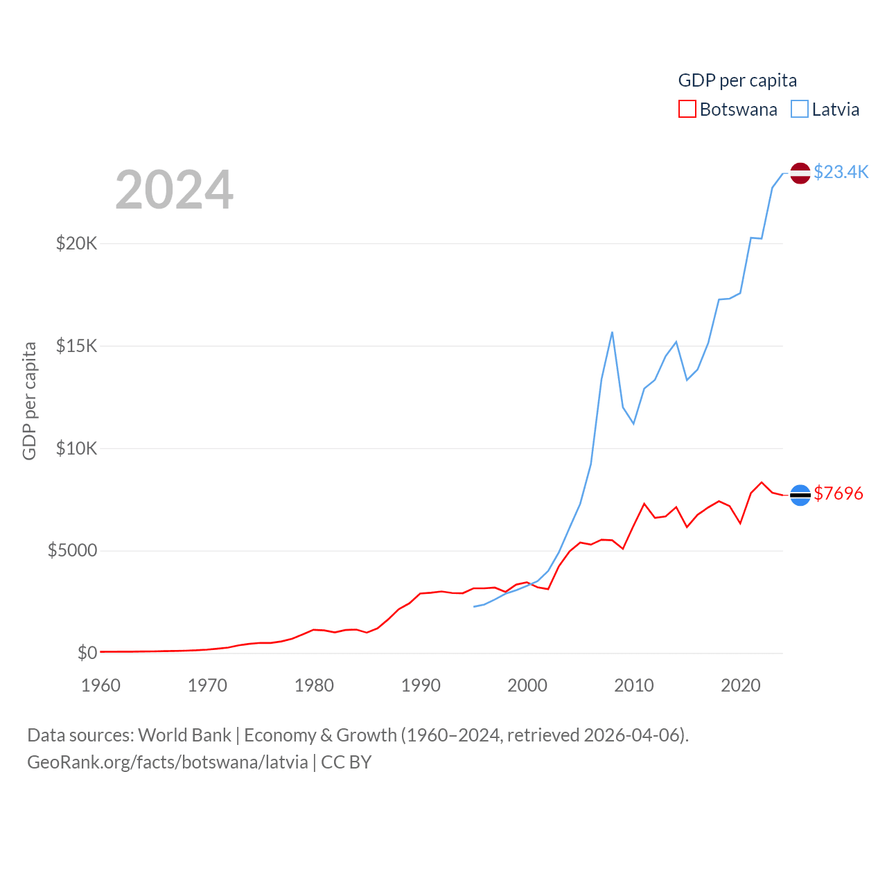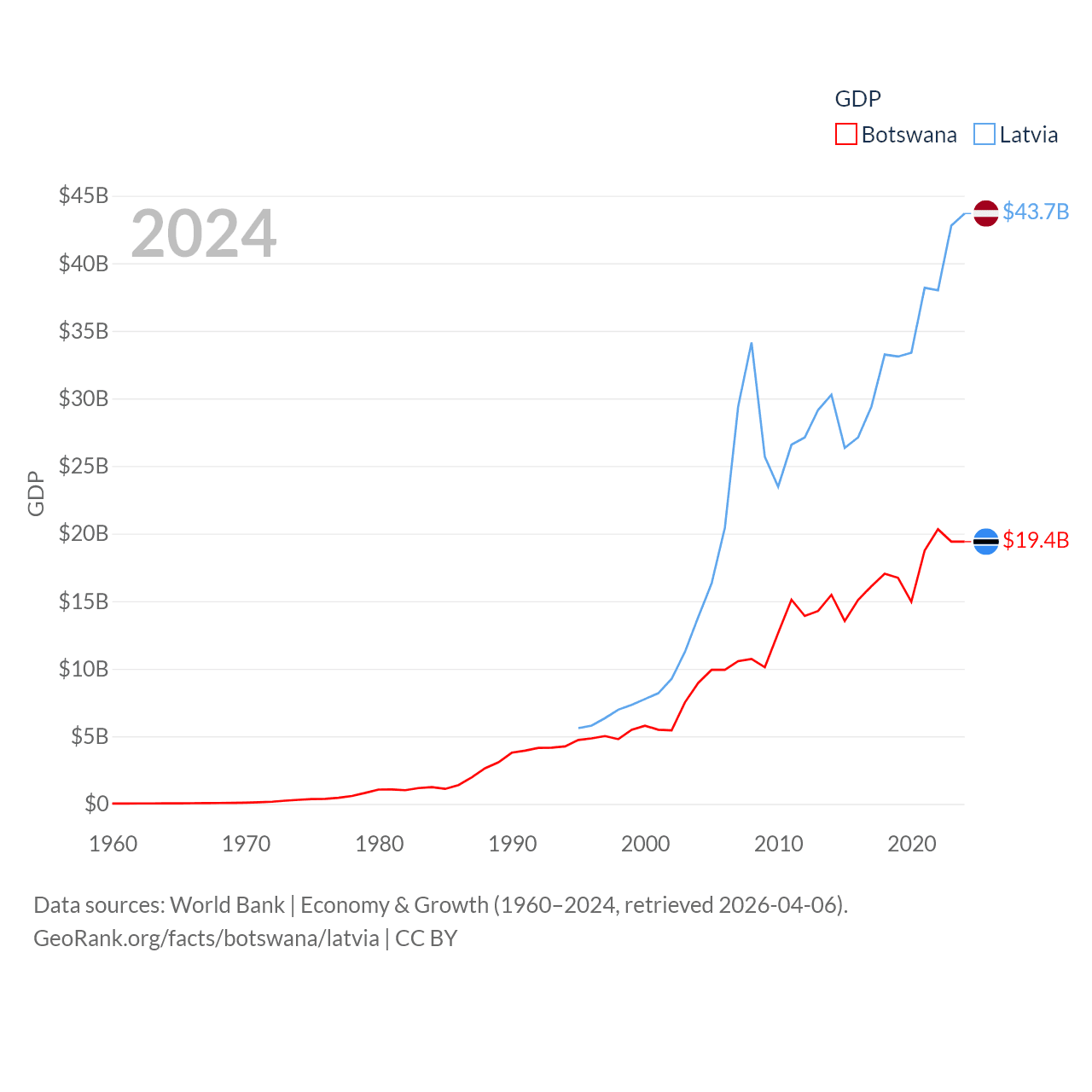 By GDP, Botswana ranks 133/197 ($19.4B) and Latvia ranks 99/197 ($43.7B). By GDP per capita, Botswana ranks 97/197 ($7,696), while Latvia ranks 54/197 ($23,409).