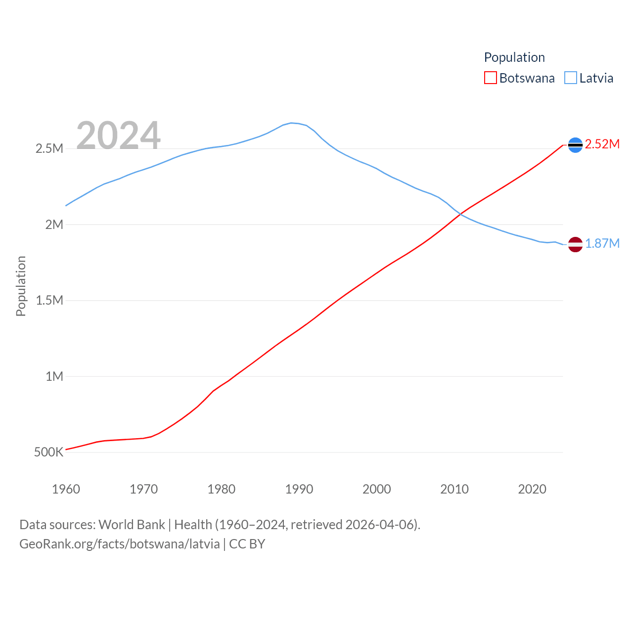 Botswana has a population of 2.52M (ranked 142/197), compared with 1.87M in Latvia (ranked 149/197). Botswana's land area is 218,816 sq mi versus 24,027 sq mi for Latvia (ranked 47th vs. 121st).