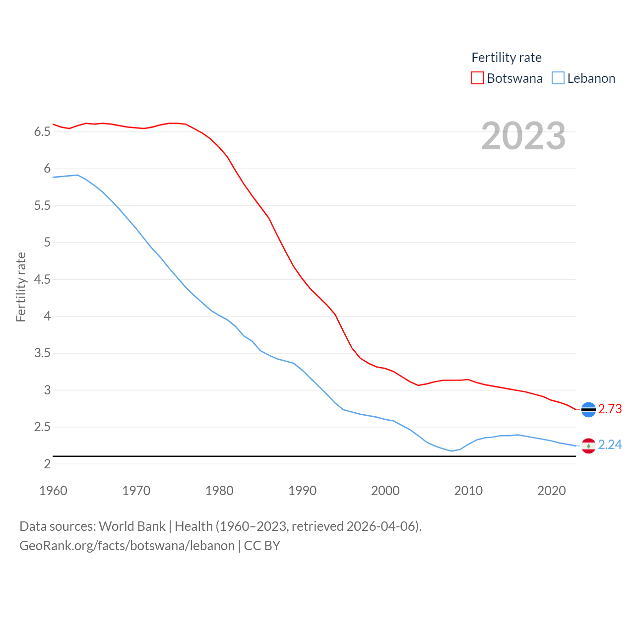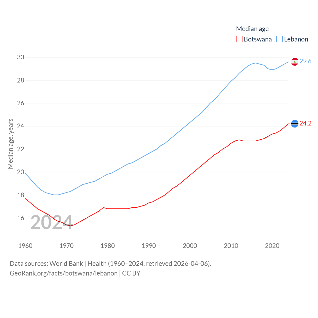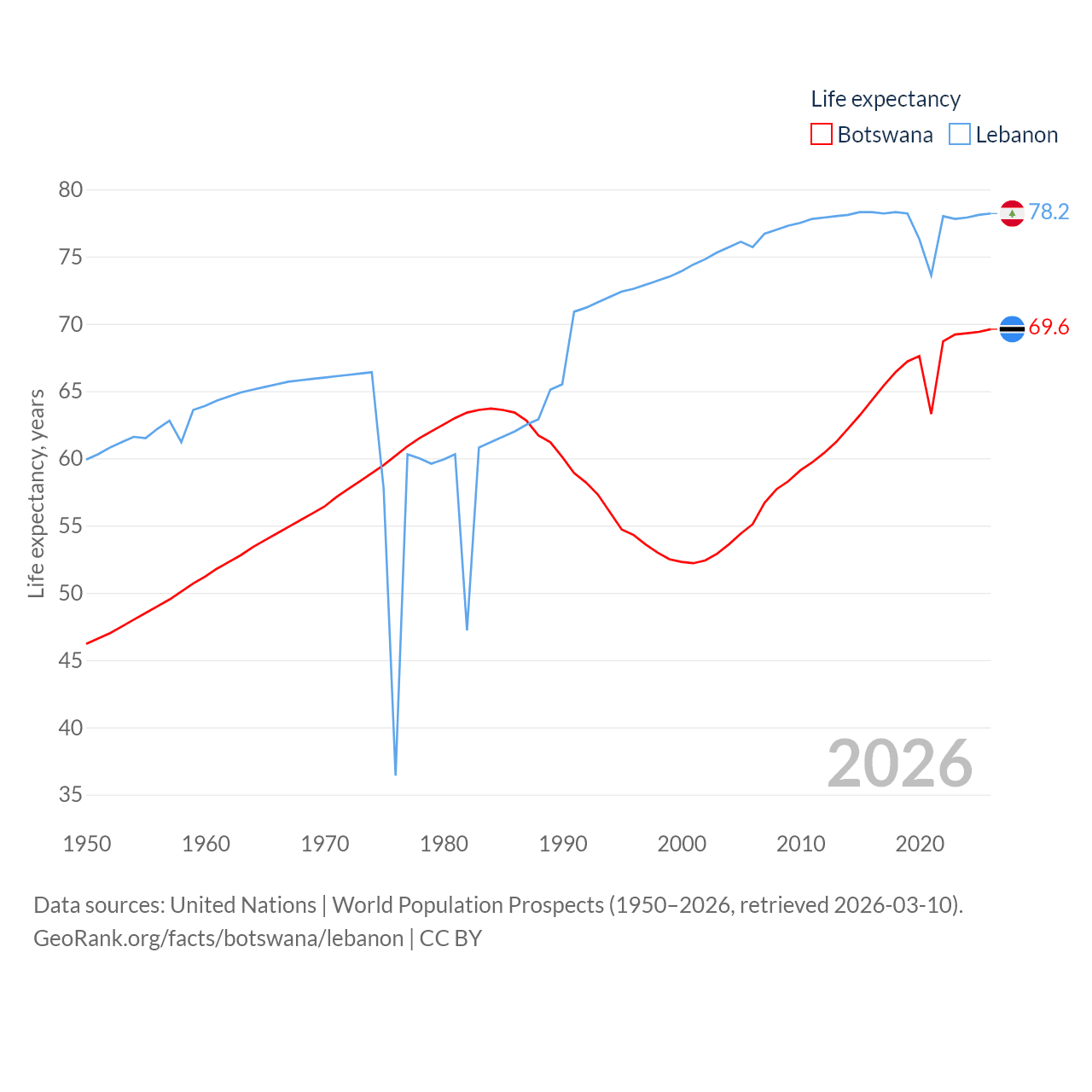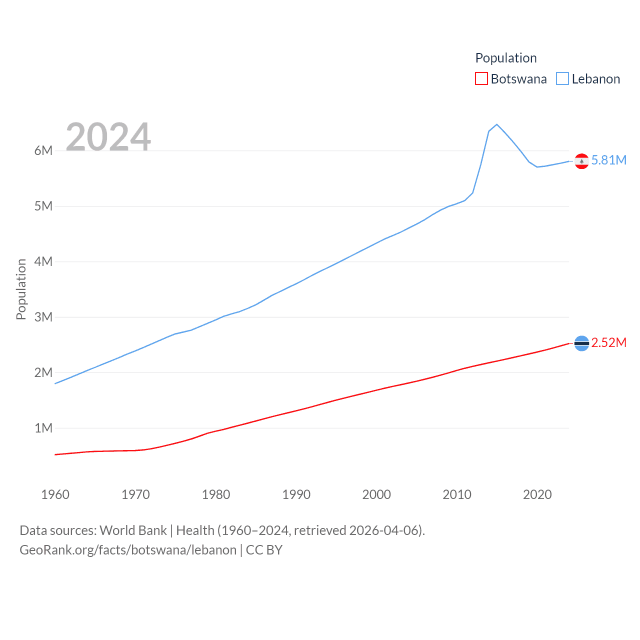 Botswana has a population of 2.52M (ranked 142/197), compared with 5.81M in Lebanon (ranked 115/197). Botswana's land area is 218,816 sq mi versus 3,950 sq mi for Lebanon (ranked 47th vs. 160th).