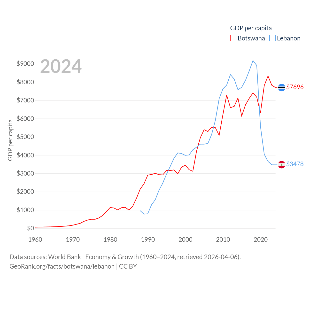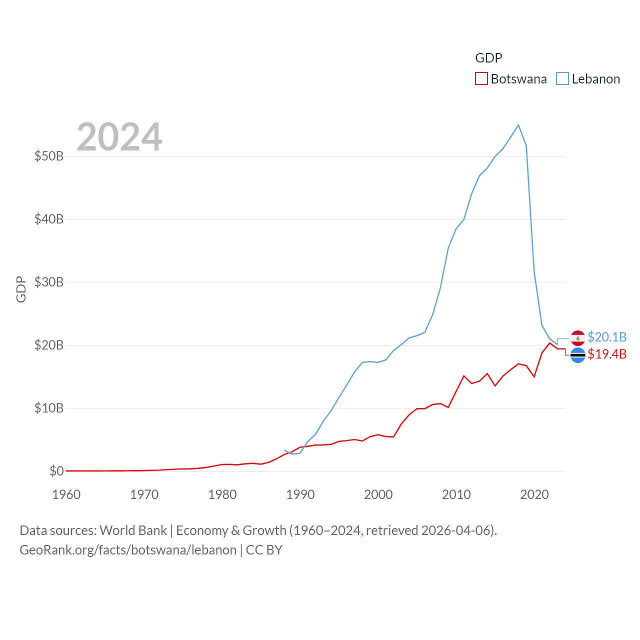 By GDP, Botswana ranks 133/197 ($19.4B) and Lebanon ranks 128/197 ($20.1B). By GDP per capita, Botswana ranks 97/197 ($7,696), while Lebanon ranks 135/197 ($3,478).
