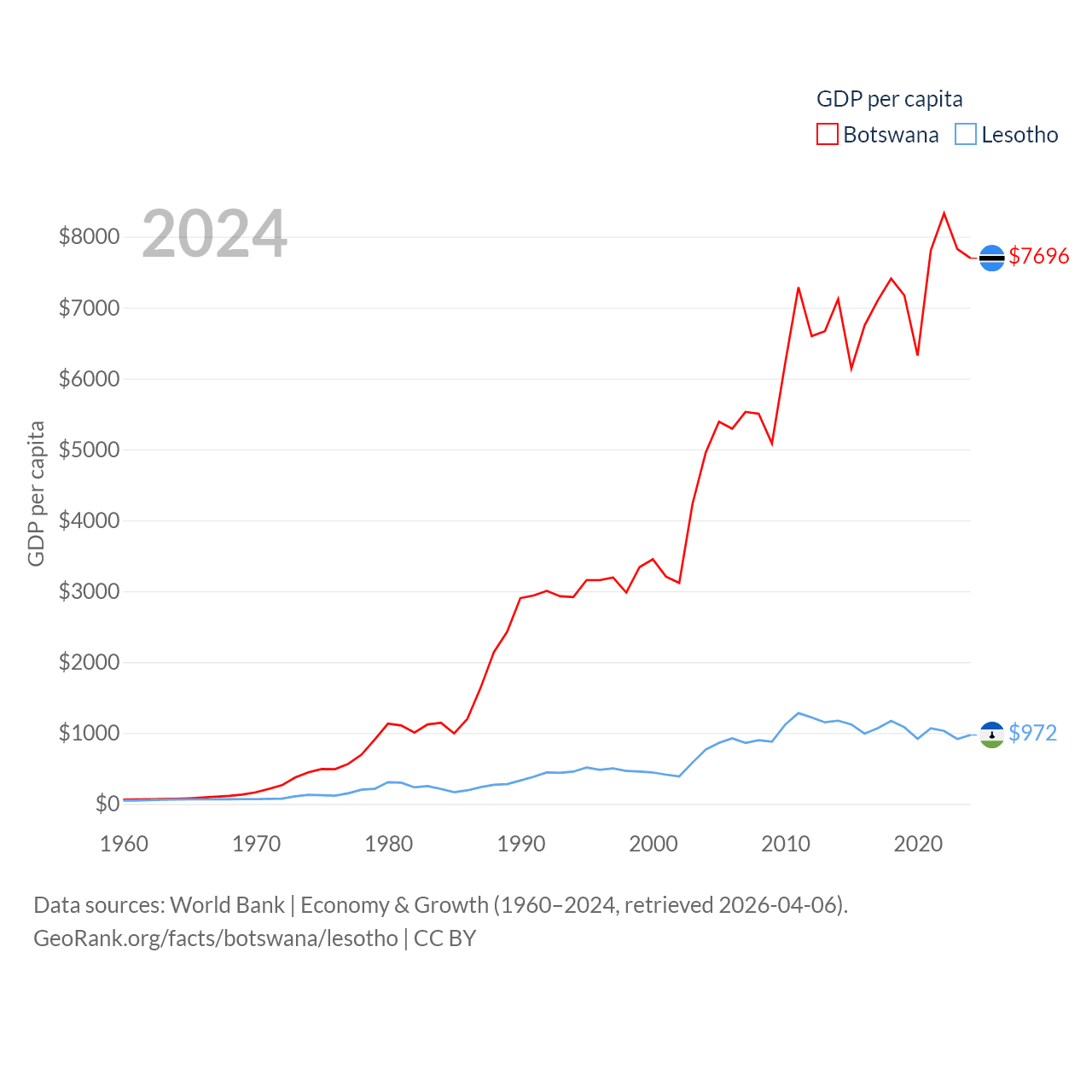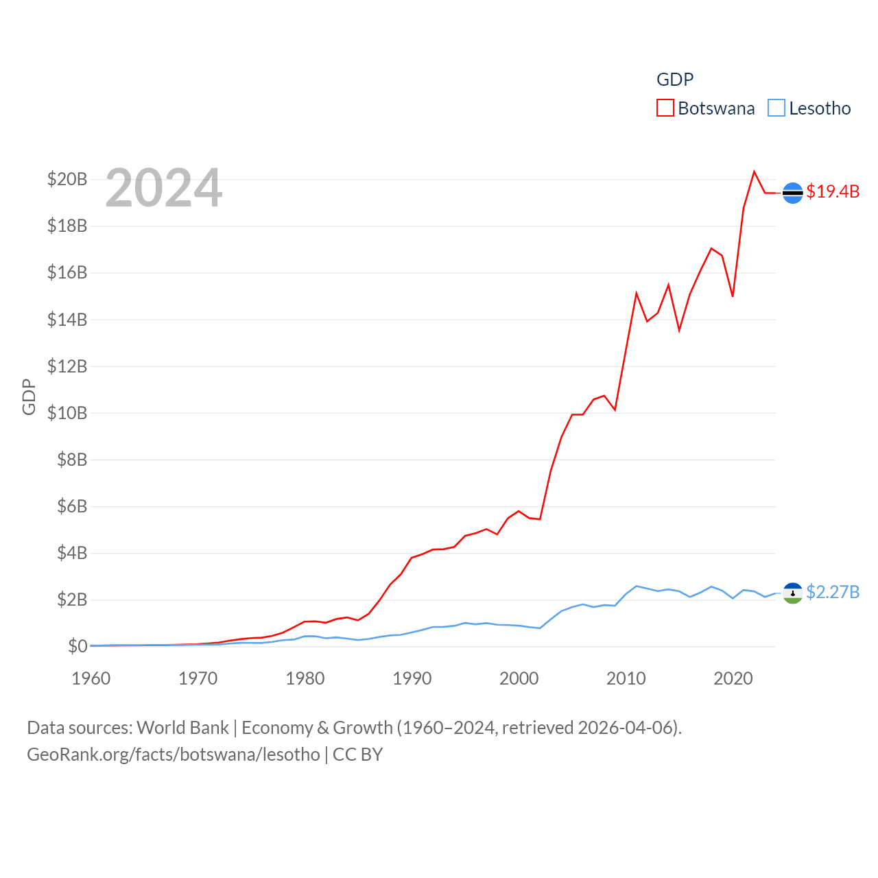 By GDP, Botswana ranks 133/197 ($19.4B) and Lesotho ranks 175/197 ($2.27B). By GDP per capita, Botswana ranks 97/197 ($7,696), while Lesotho ranks 181/197 ($972).
