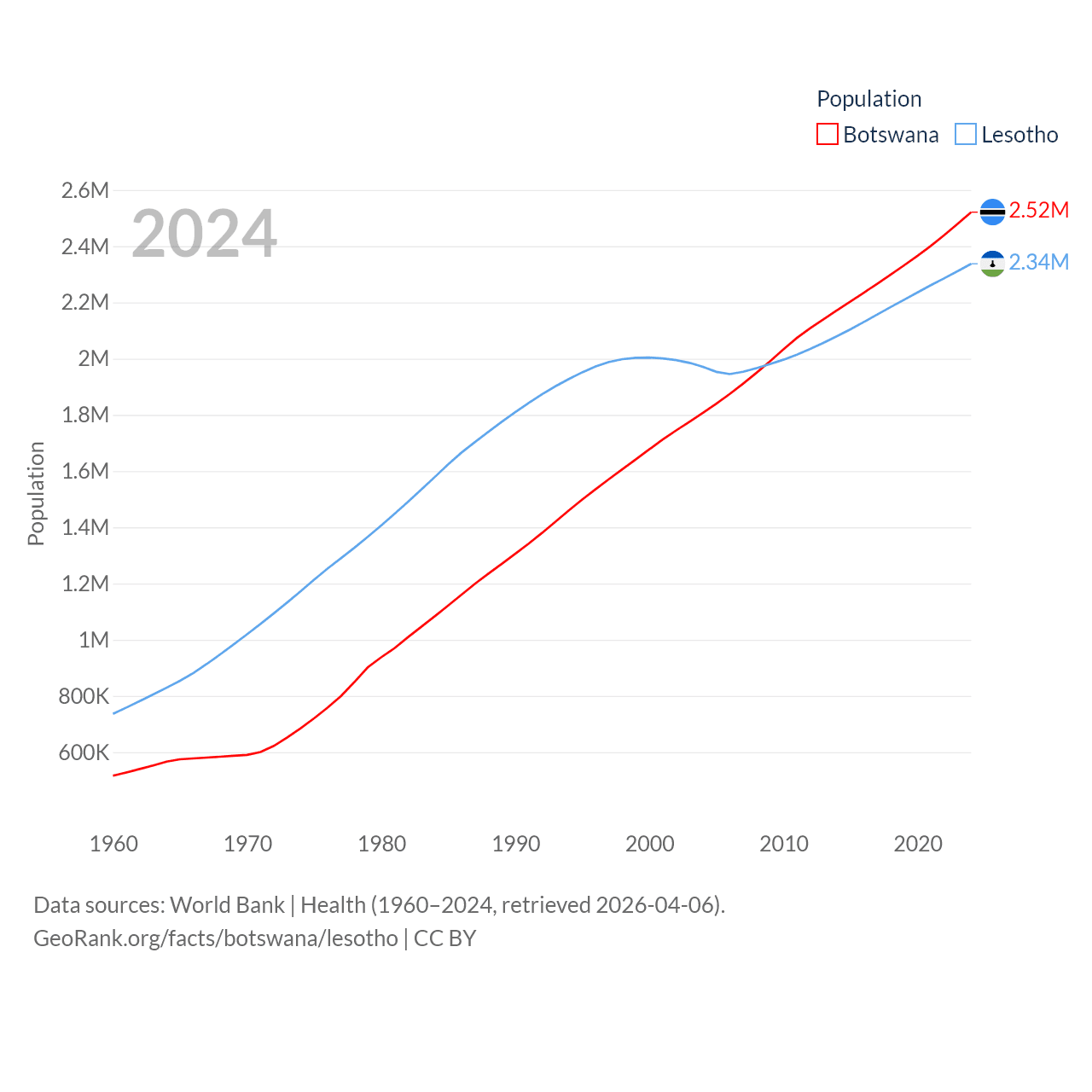 Botswana has a population of 2.52M (ranked 142/197), compared with 2.34M in Lesotho (ranked 145/197). Botswana's land area is 218,816 sq mi versus 11,722 sq mi for Lesotho (ranked 47th vs. 137th).