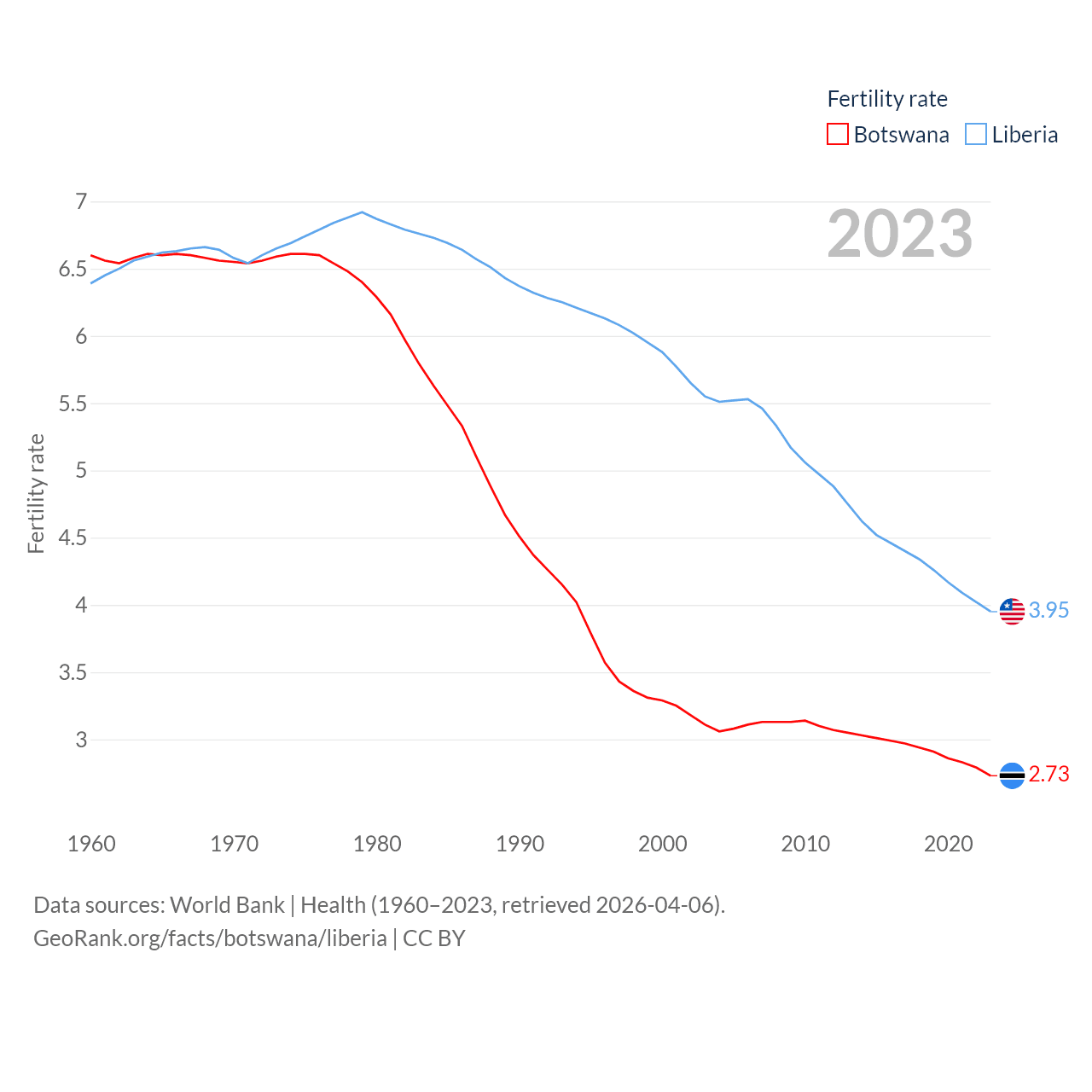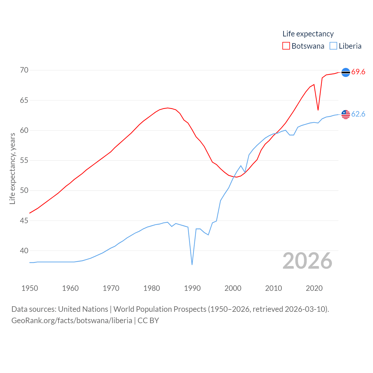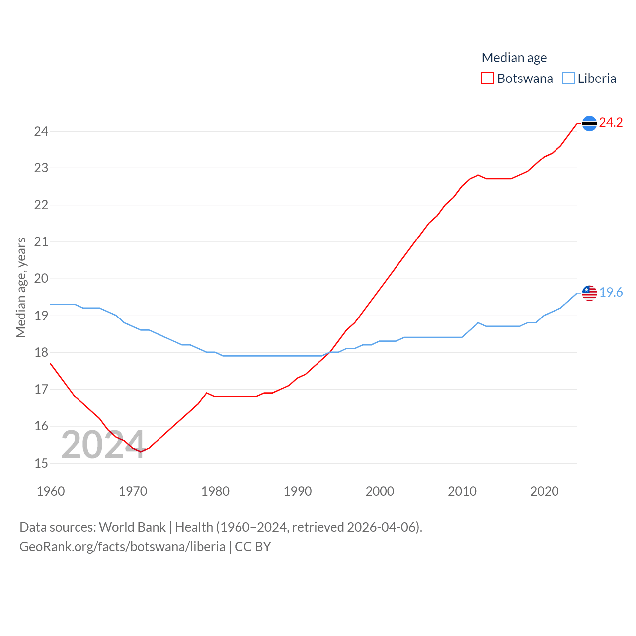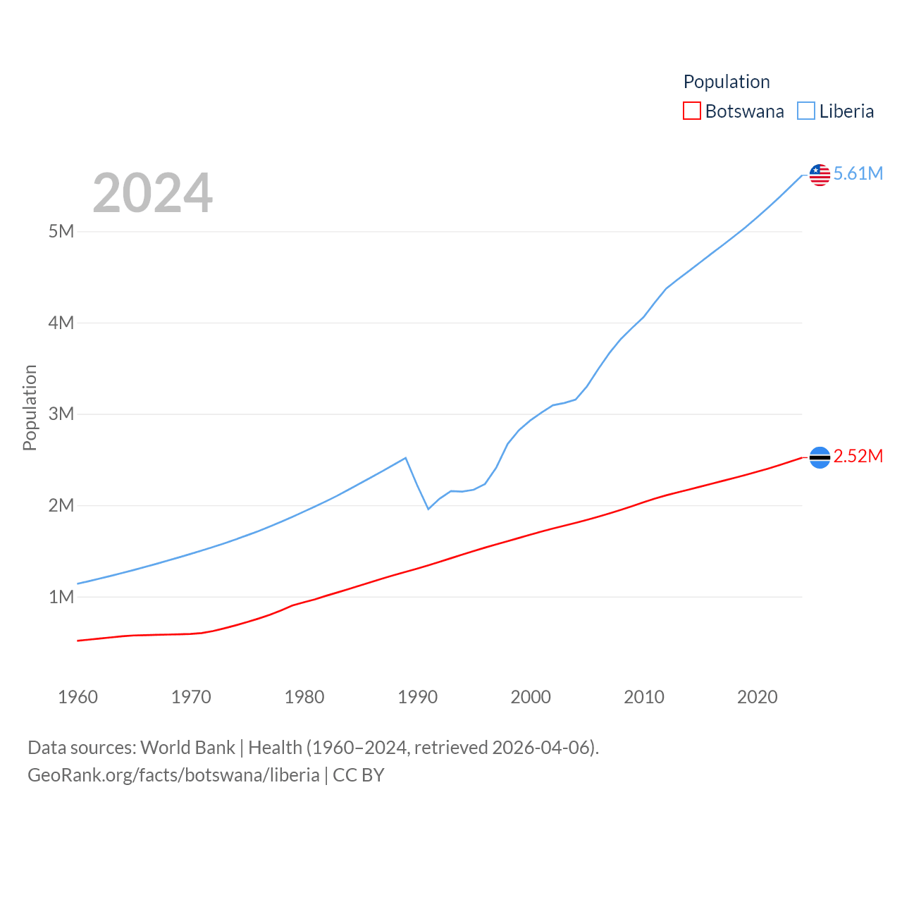 Botswana has a population of 2.52M (ranked 142/197), compared with 5.61M in Liberia (ranked 117/197). Botswana's land area is 218,816 sq mi versus 37,189 sq mi for Liberia (ranked 47th vs. 106th).