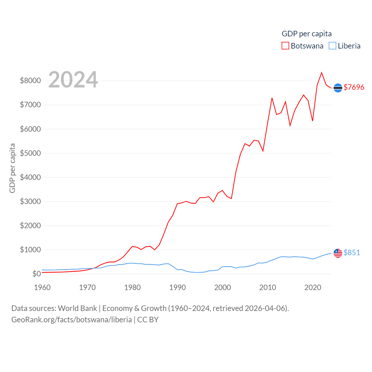 By GDP, Botswana ranks 133/197 ($19.4B) and Liberia ranks 163/197 ($4.78B). By GDP per capita, Botswana ranks 97/197 ($7,696), while Liberia ranks 184/197 ($851).