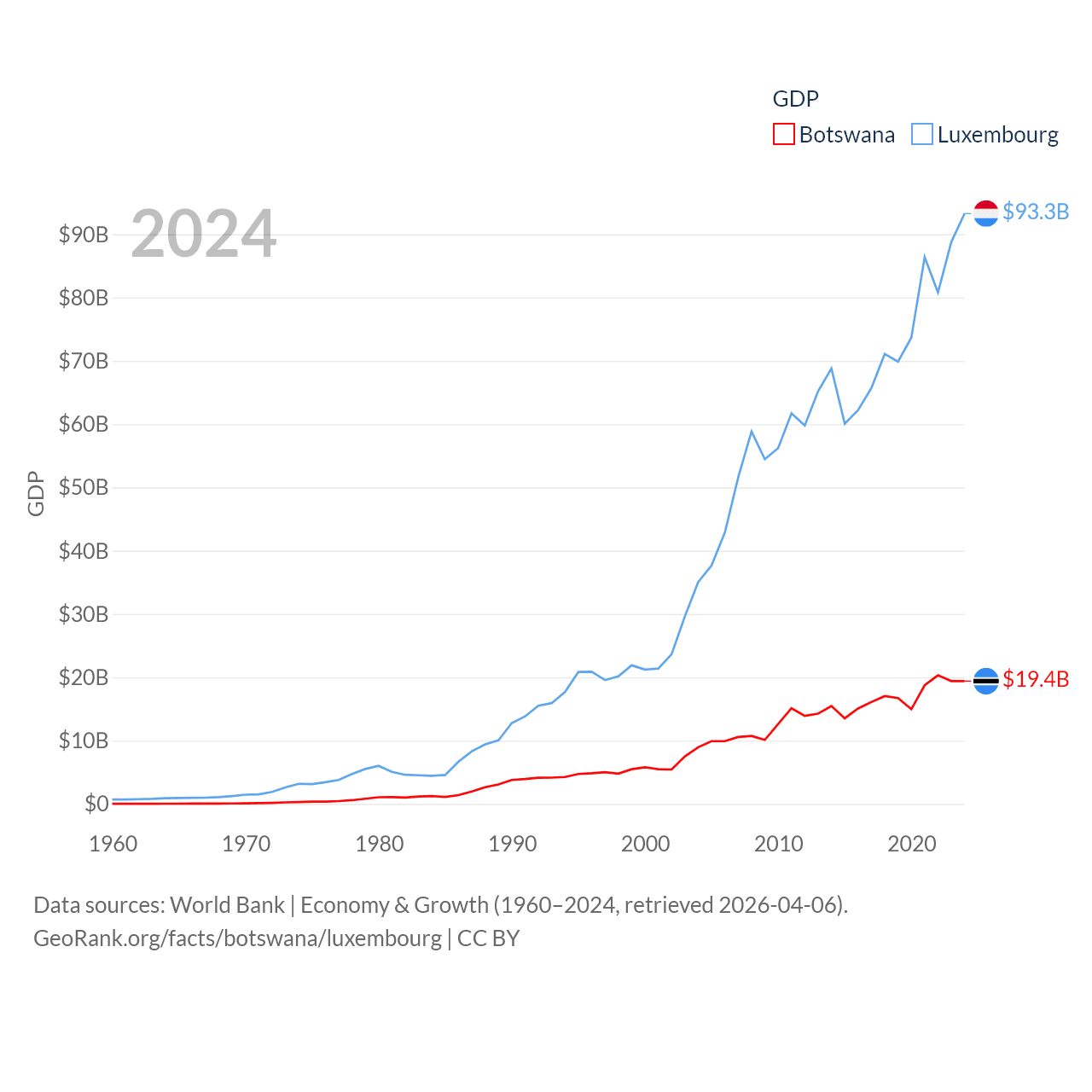 By GDP, Botswana ranks 133/197 ($19.4B) and Luxembourg ranks 74/197 ($93.3B). By GDP per capita, Botswana ranks 97/197 ($7,696), while Luxembourg ranks 3/197 ($137,782).