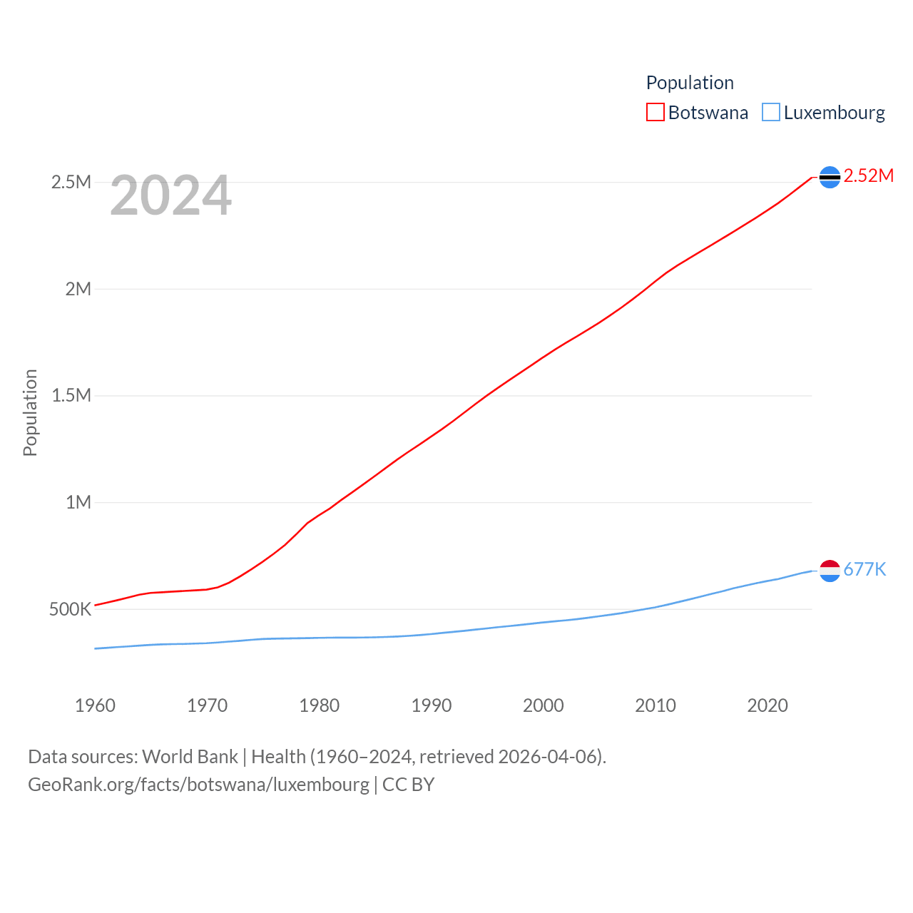 Botswana has a population of 2.52M (ranked 142/197), compared with 677K in Luxembourg (ranked 164/197). Botswana's land area is 218,816 sq mi versus 994 sq mi for Luxembourg (ranked 47th vs. 169th).