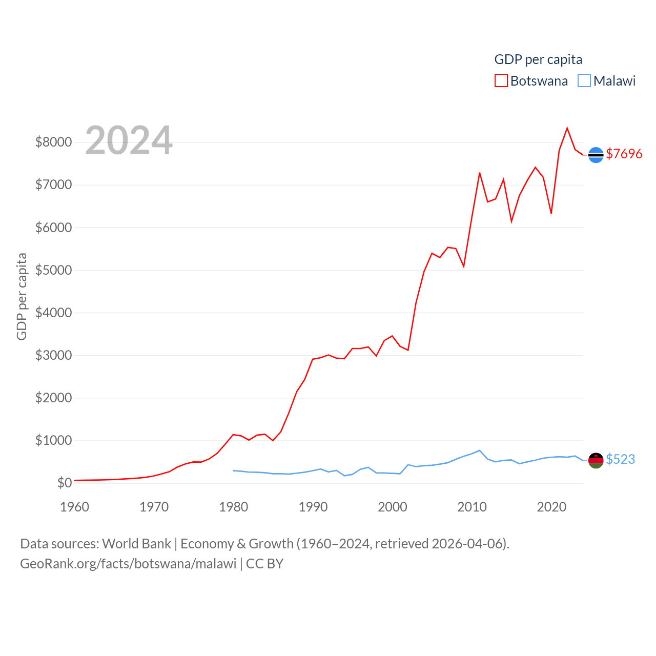 By GDP, Botswana ranks 133/197 ($19.4B) and Malawi ranks 151/197 ($11.3B). By GDP per capita, Botswana ranks 97/197 ($7,696), while Malawi ranks 194/197 ($523).