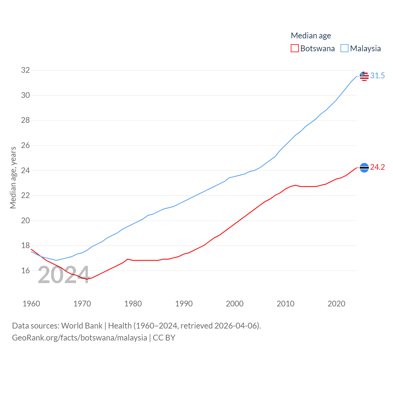 Botswana has a population of 2.52M (ranked 142/197), compared with 35.6M in Malaysia (ranked 44/197). Botswana's land area is 218,816 sq mi versus 126,854 sq mi for Malaysia (ranked 47th vs. 65th).