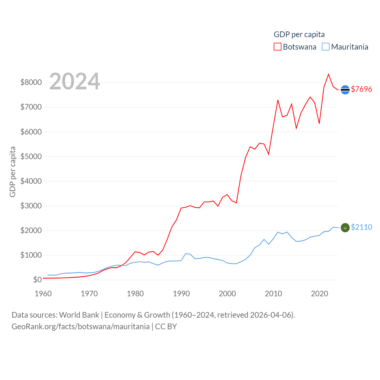 By GDP, Botswana ranks 133/197 ($19.4B) and Mauritania ranks 153/197 ($10.9B). By GDP per capita, Botswana ranks 97/197 ($7,696), while Mauritania ranks 156/197 ($2,110).