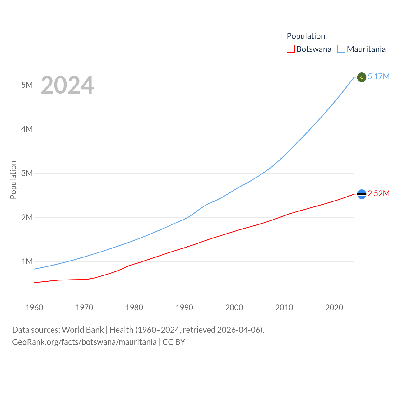 Botswana has a population of 2.52M (ranked 142/197), compared with 5.17M in Mauritania (ranked 125/197). Botswana's land area is 218,816 sq mi versus 397,955 sq mi for Mauritania (ranked 47th vs. 28th).