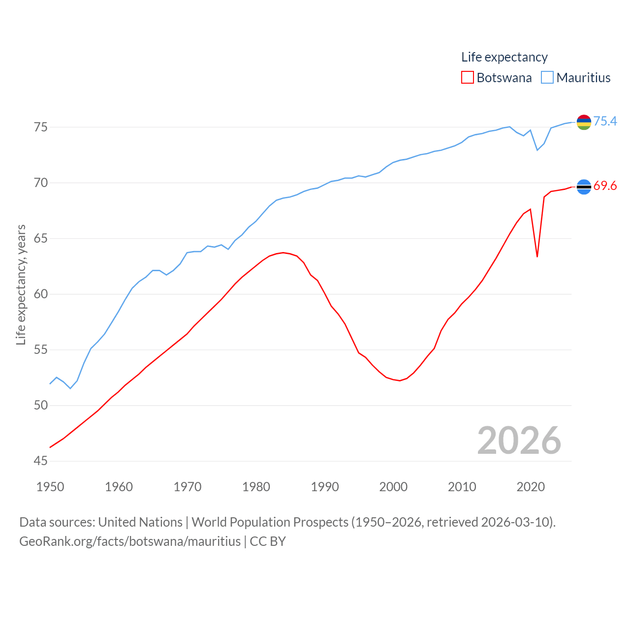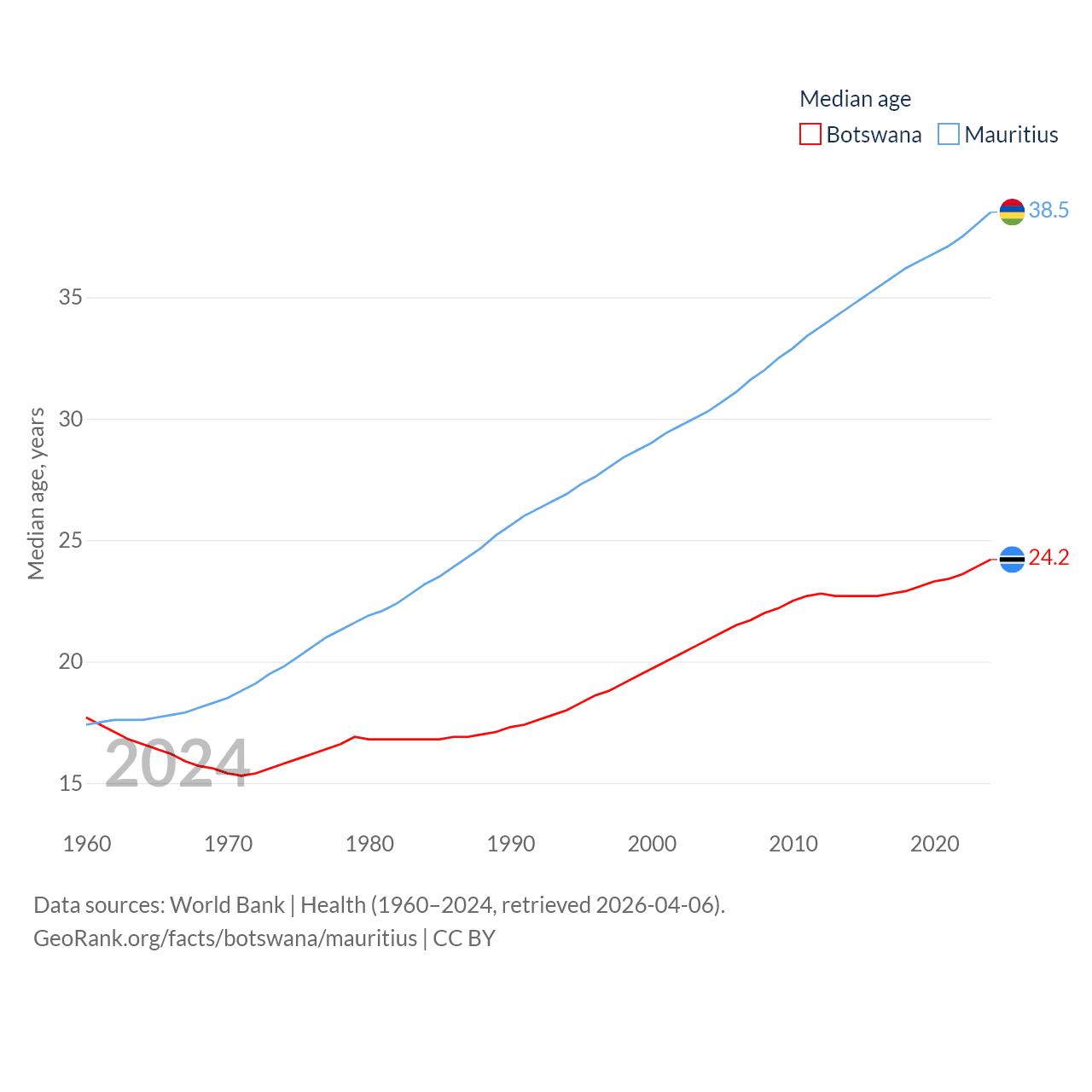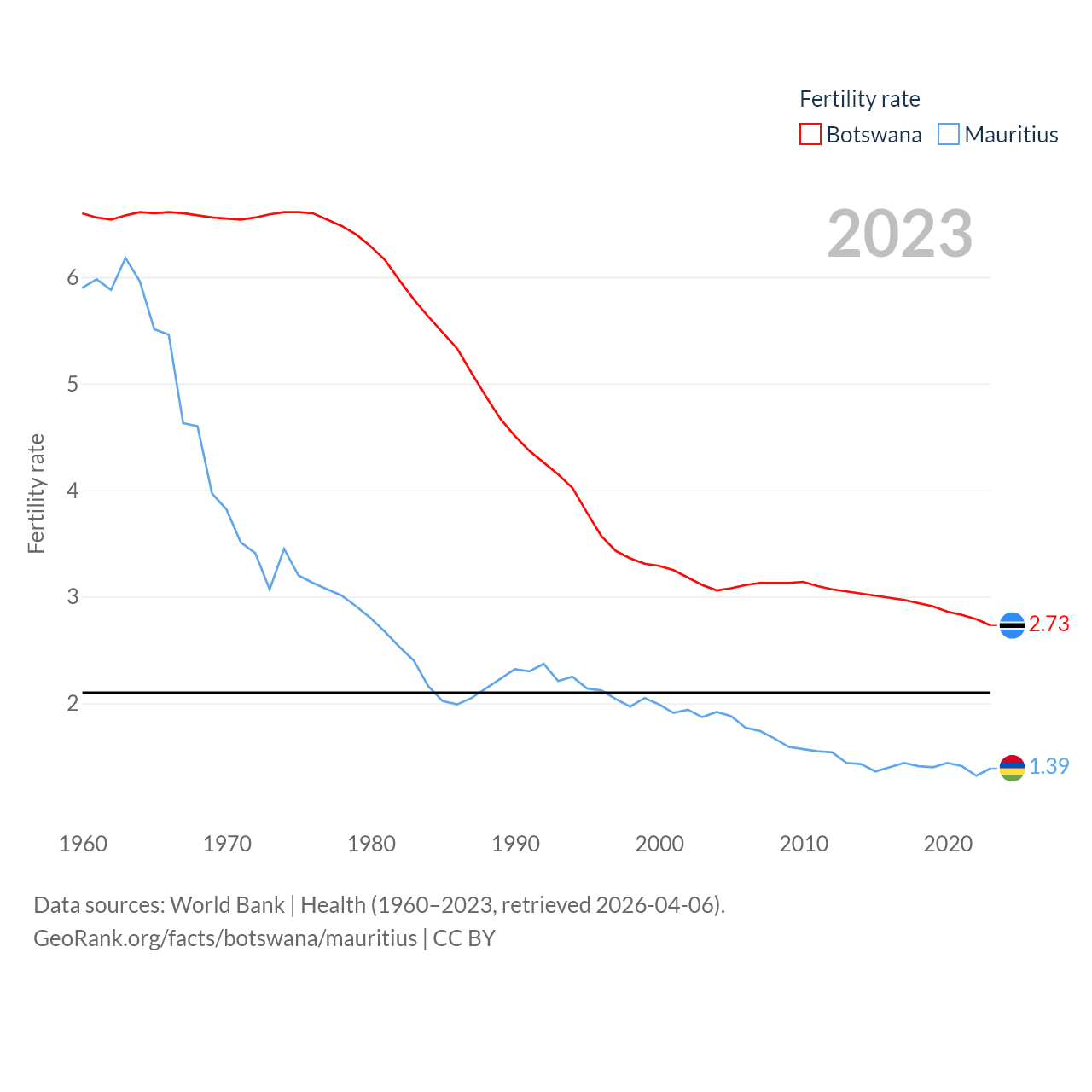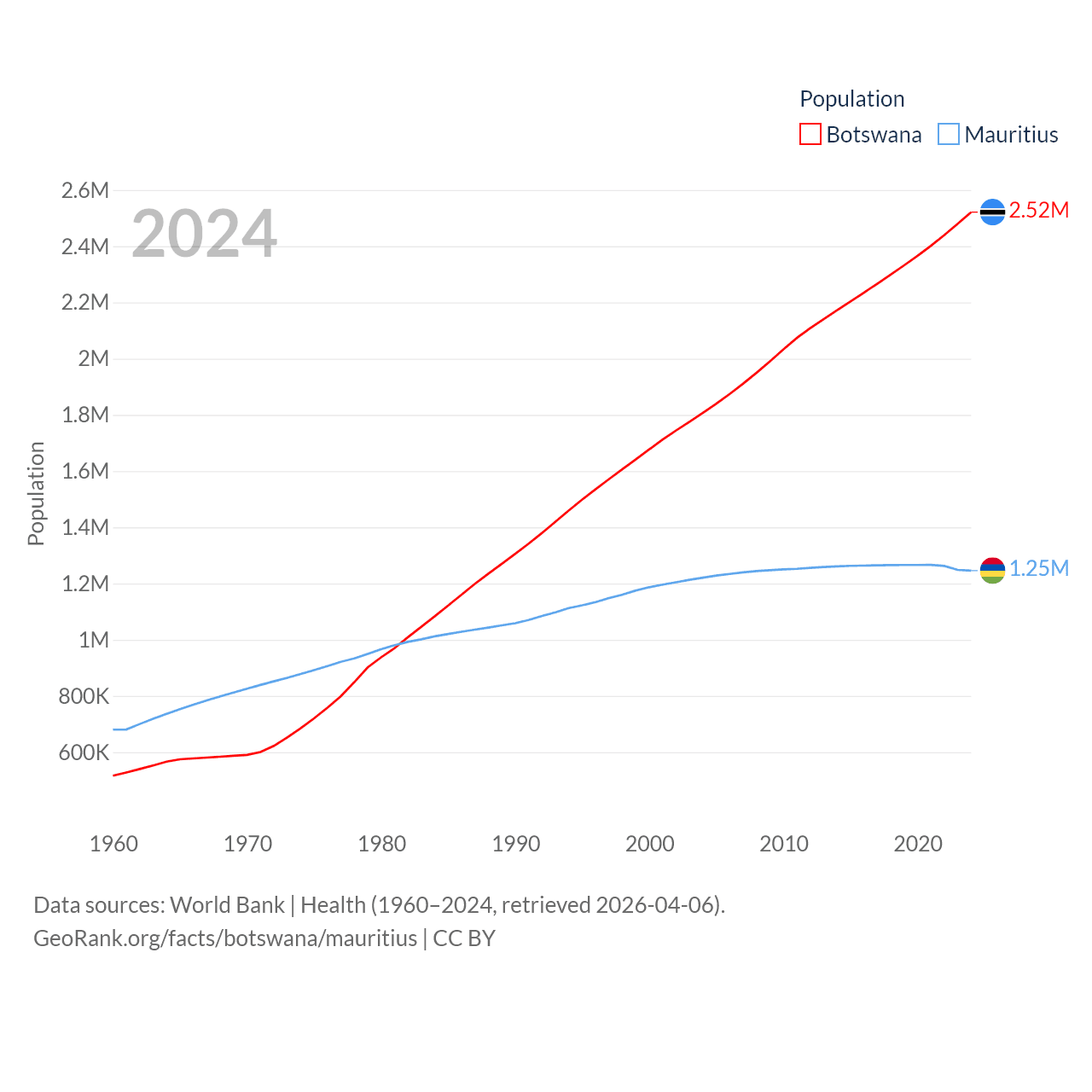 Botswana has a population of 2.52M (ranked 142/197), compared with 1.25M in Mauritius (ranked 156/197). Botswana's land area is 218,816 sq mi versus 771 sq mi for Mauritius (ranked 47th vs. 170th).