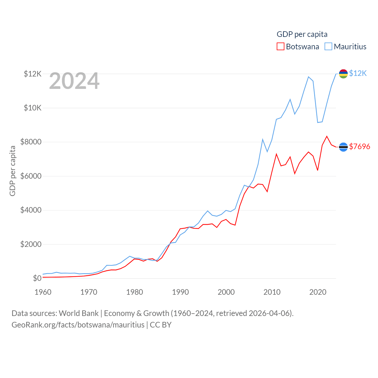 By GDP, Botswana ranks 133/197 ($19.4B) and Mauritius ranks 143/197 ($14.9B). By GDP per capita, Botswana ranks 97/197 ($7,696), while Mauritius ranks 78/197 ($11,991).