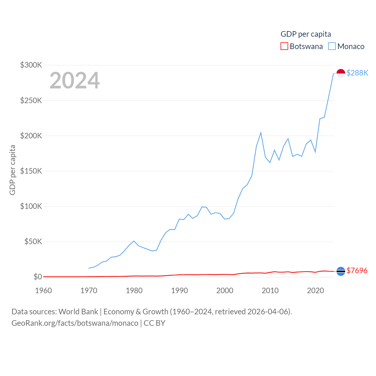 By GDP, Botswana ranks 133/197 ($19.4B) and Monaco ranks 152/197 ($11.1B). By GDP per capita, Botswana ranks 97/197 ($7,696), while Monaco ranks 1/197 ($288,001).