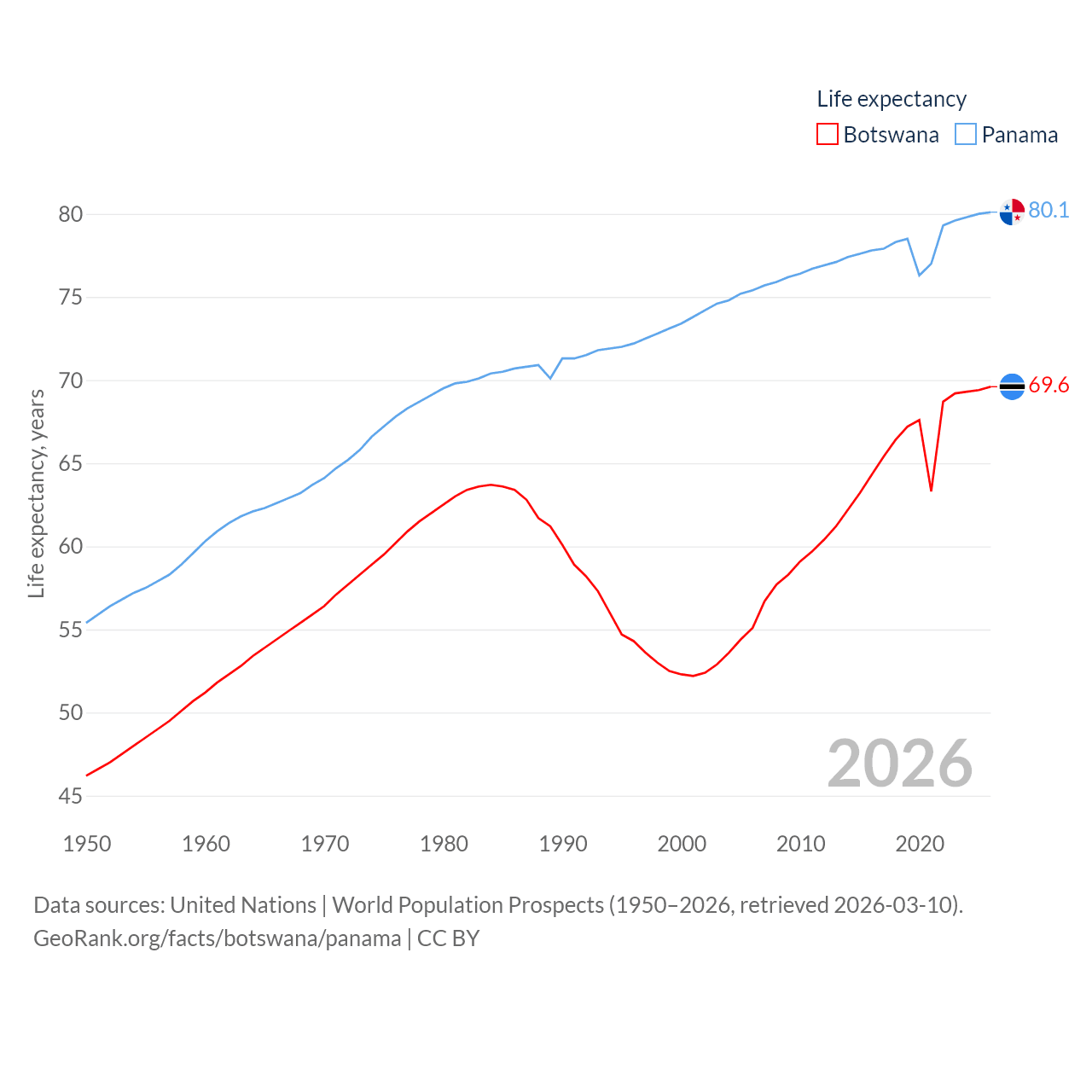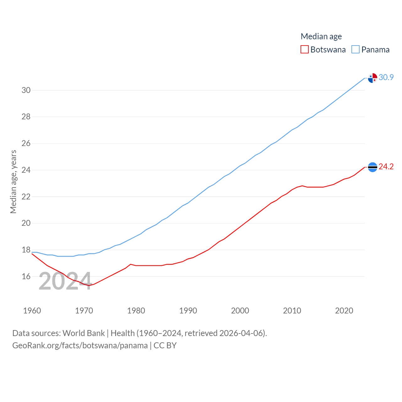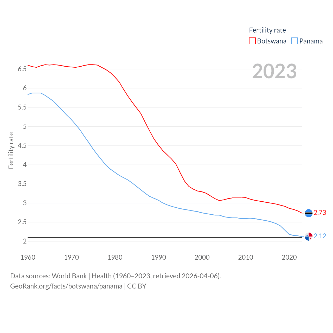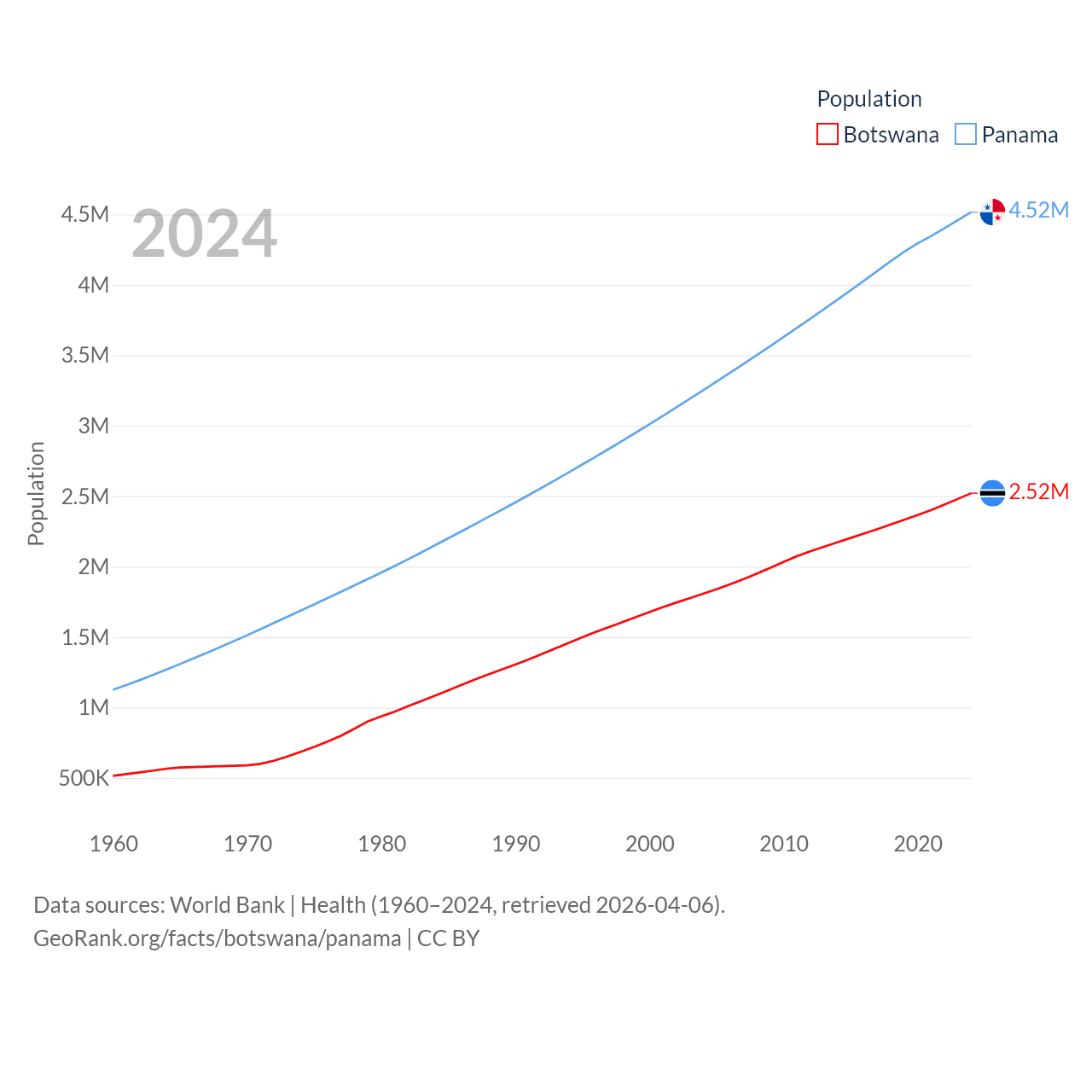 Botswana has a population of 2.52M (ranked 142/197), compared with 4.52M in Panama (ranked 128/197). Botswana's land area is 218,816 sq mi versus 28,641 sq mi for Panama (ranked 47th vs. 115th).