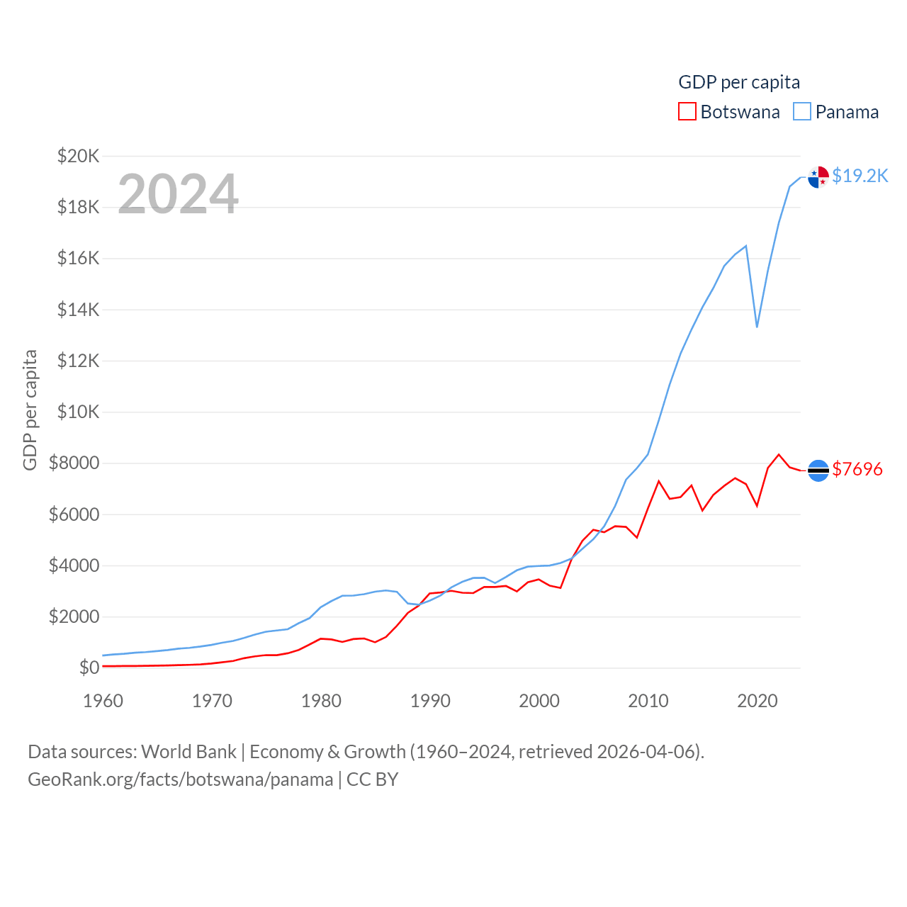By GDP, Botswana ranks 133/197 ($19.4B) and Panama ranks 78/197 ($86.5B). By GDP per capita, Botswana ranks 97/197 ($7,696), while Panama ranks 60/197 ($19,161).