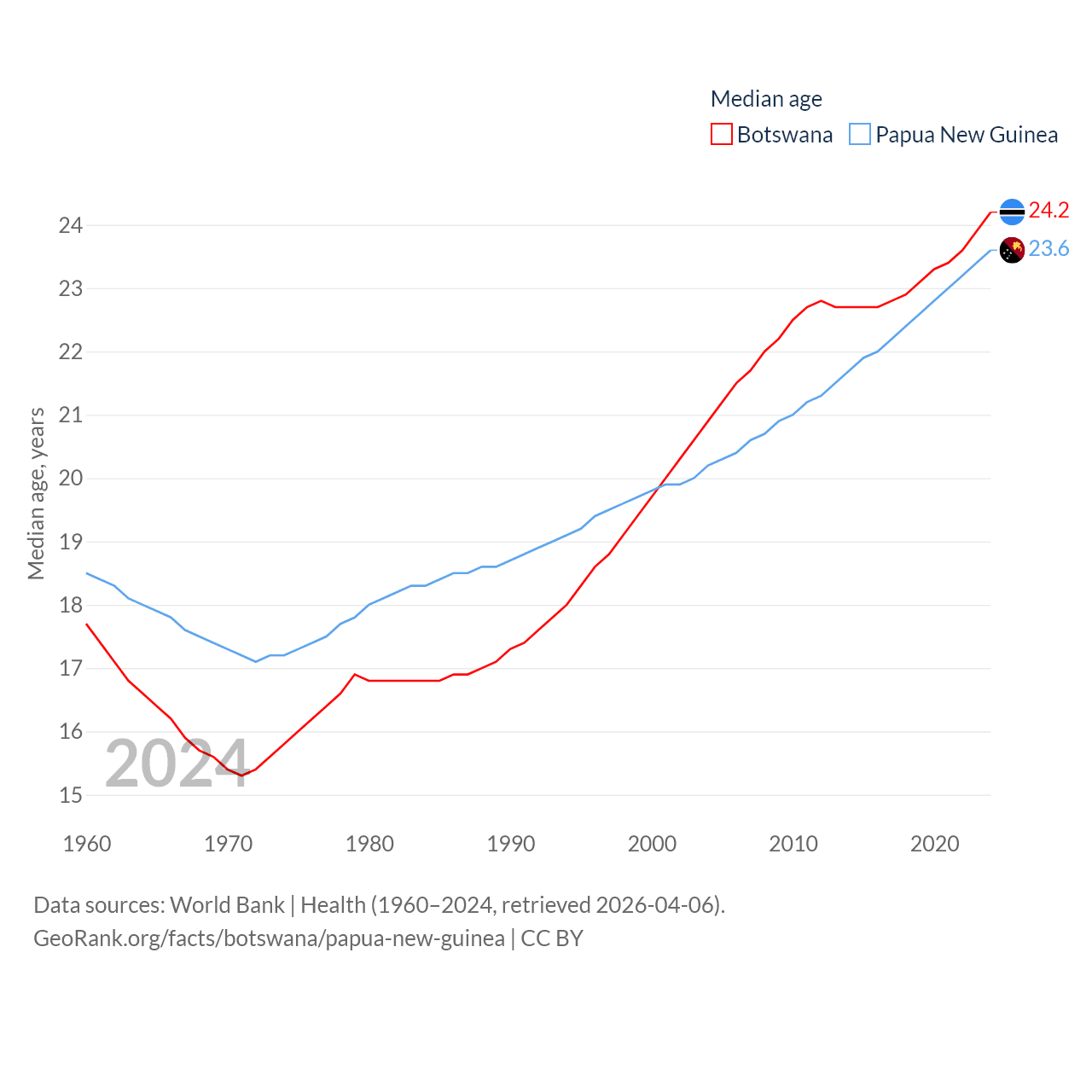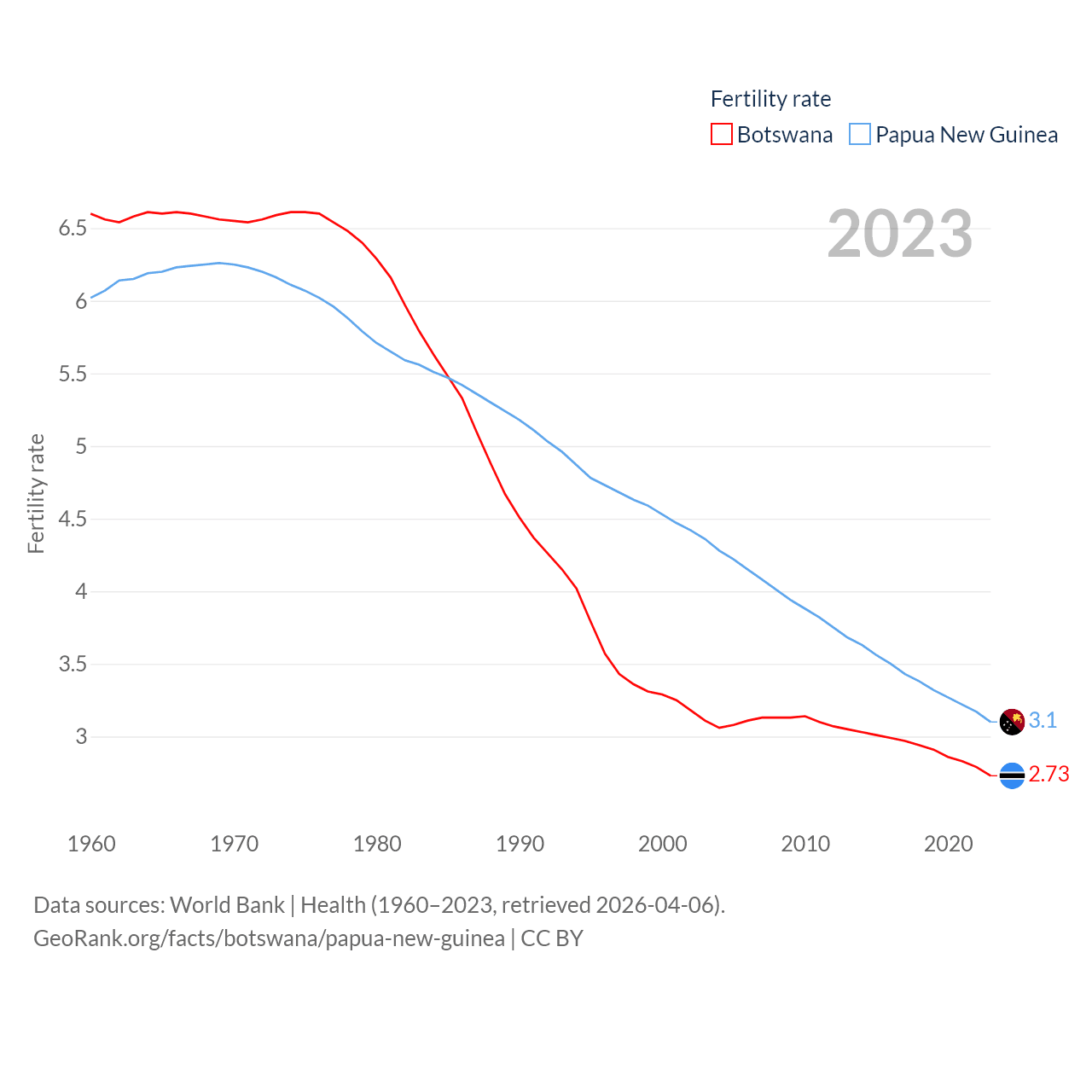 Botswana has a population of 2.52M (ranked 142/197), compared with 10.6M in Papua New Guinea (ranked 92/197). Botswana's land area is 218,816 sq mi versus 174,850 sq mi for Papua New Guinea (ranked 47th vs. 54th).