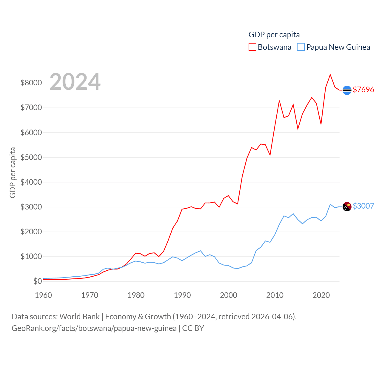 By GDP, Botswana ranks 133/197 ($19.4B) and Papua New Guinea ranks 110/197 ($31.8B). By GDP per capita, Botswana ranks 97/197 ($7,696), while Papua New Guinea ranks 140/197 ($3,007).