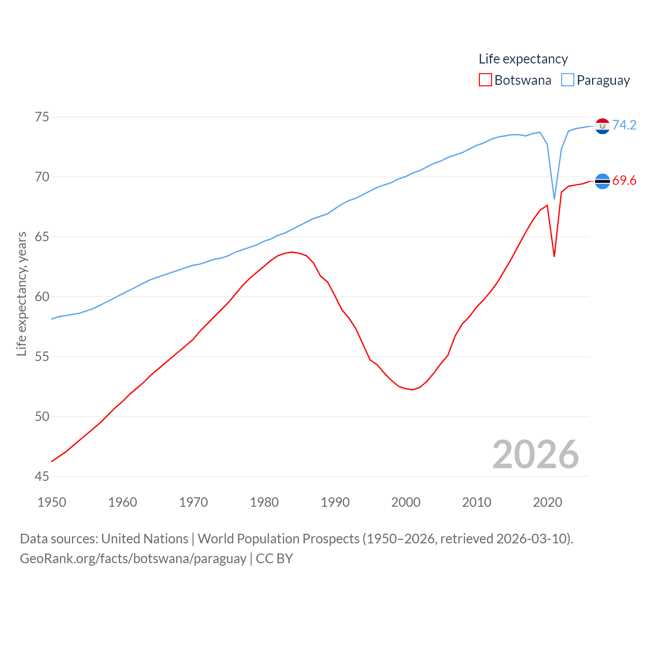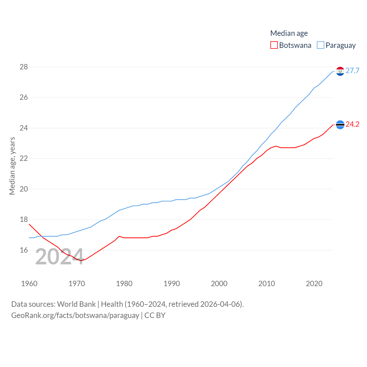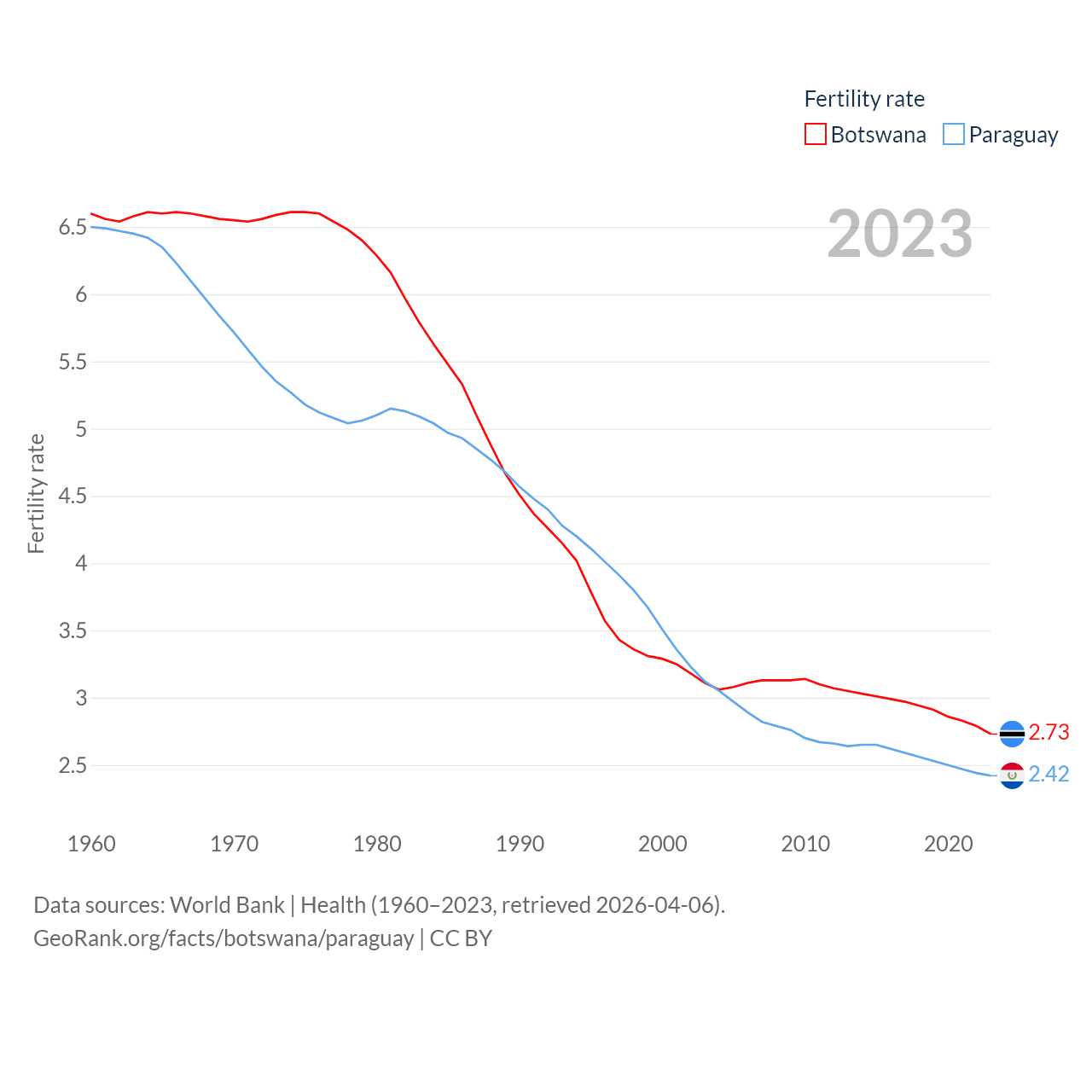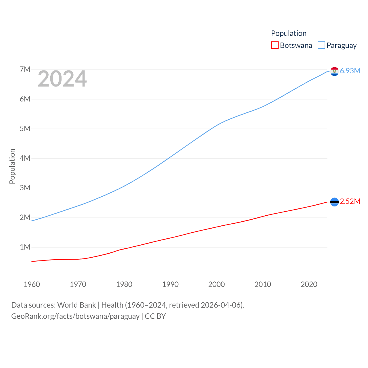 Botswana has a population of 2.52M (ranked 142/197), compared with 6.93M in Paraguay (ranked 107/197). Botswana's land area is 218,816 sq mi versus 152,901 sq mi for Paraguay (ranked 47th vs. 59th).