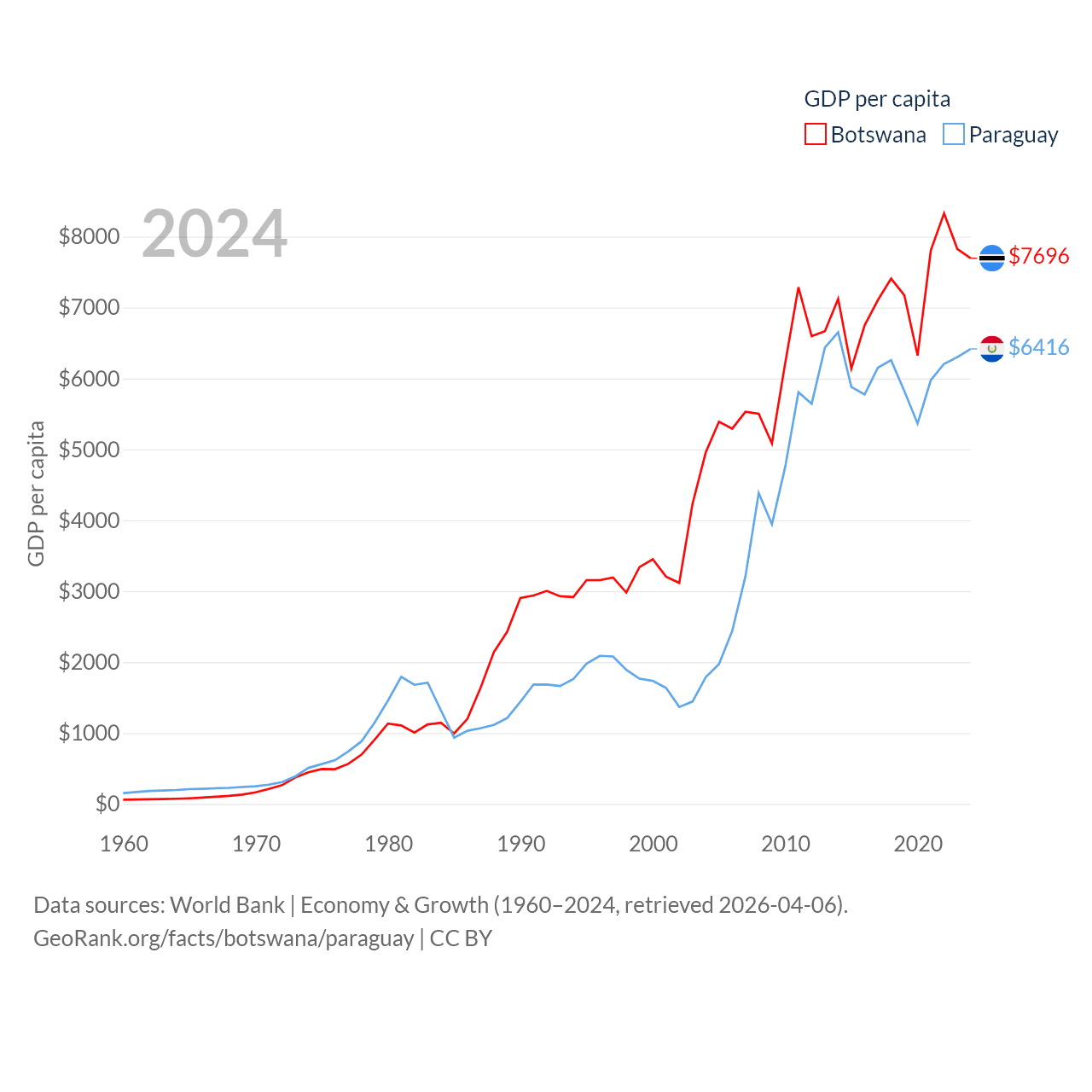 By GDP, Botswana ranks 133/197 ($19.4B) and Paraguay ranks 98/197 ($44.5B). By GDP per capita, Botswana ranks 97/197 ($7,696), while Paraguay ranks 109/197 ($6,416).