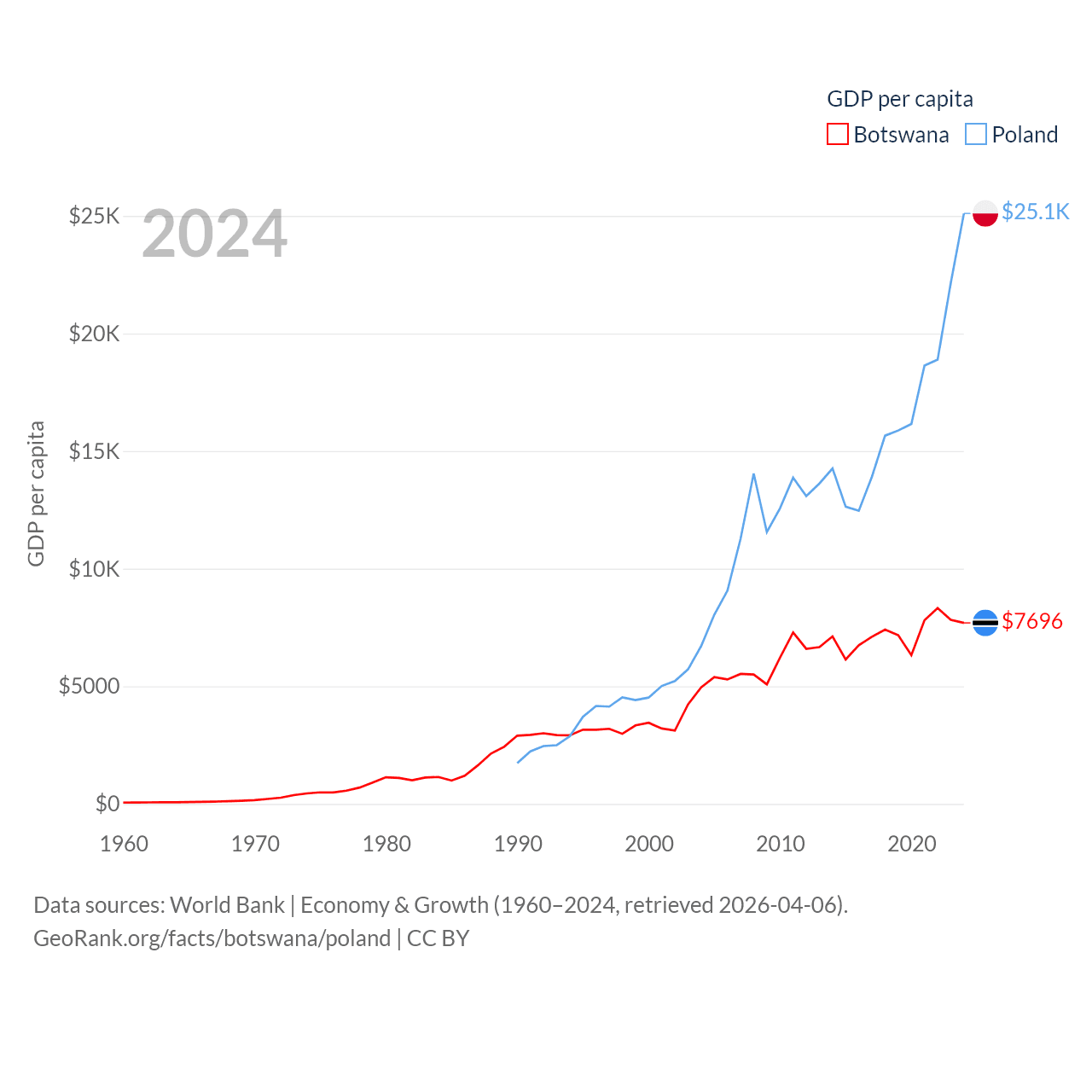 By GDP, Botswana ranks 133/197 ($19.4B) and Poland ranks 21/197 ($918B). By GDP per capita, Botswana ranks 97/197 ($7,696), while Poland ranks 48/197 ($25,104).
