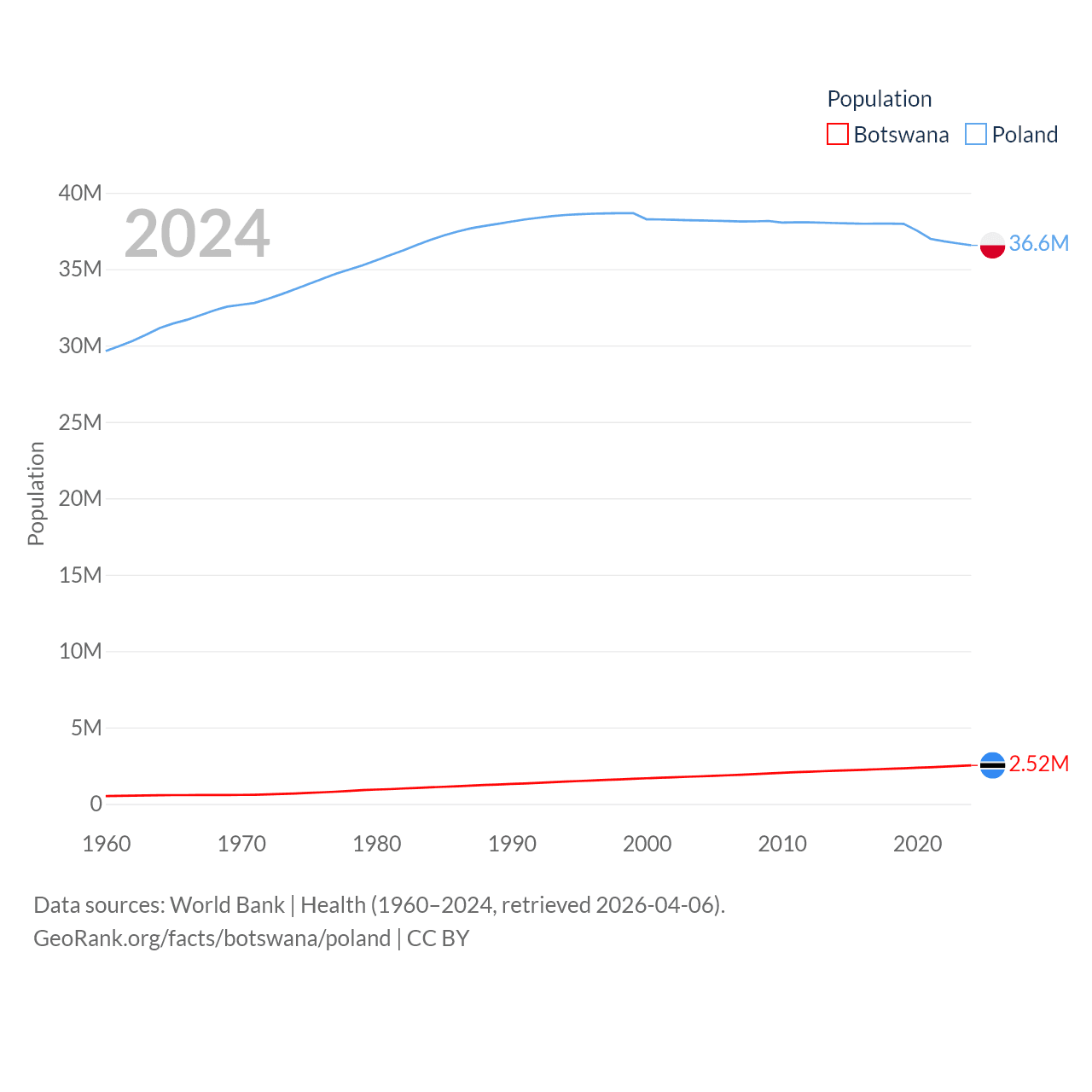 Botswana has a population of 2.52M (ranked 142/197), compared with 36.6M in Poland (ranked 42/197). Botswana's land area is 218,816 sq mi versus 118,252 sq mi for Poland (ranked 47th vs. 69th).