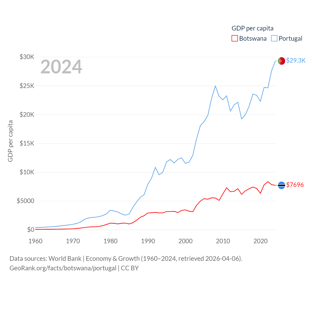 By GDP, Botswana ranks 133/197 ($19.4B) and Portugal ranks 46/197 ($313B). By GDP per capita, Botswana ranks 97/197 ($7,696), while Portugal ranks 44/197 ($29,292).