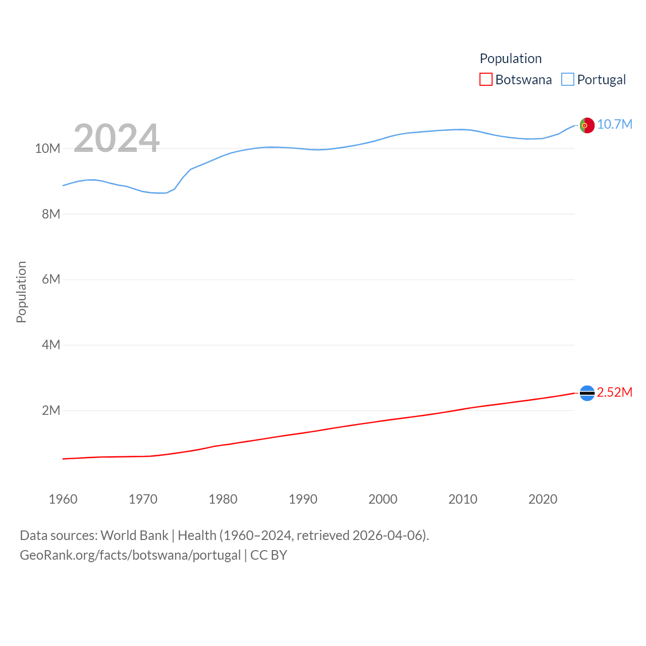 Botswana has a population of 2.52M (ranked 142/197), compared with 10.7M in Portugal (ranked 90/197). Botswana's land area is 218,816 sq mi versus 35,369 sq mi for Portugal (ranked 47th vs. 108th).
