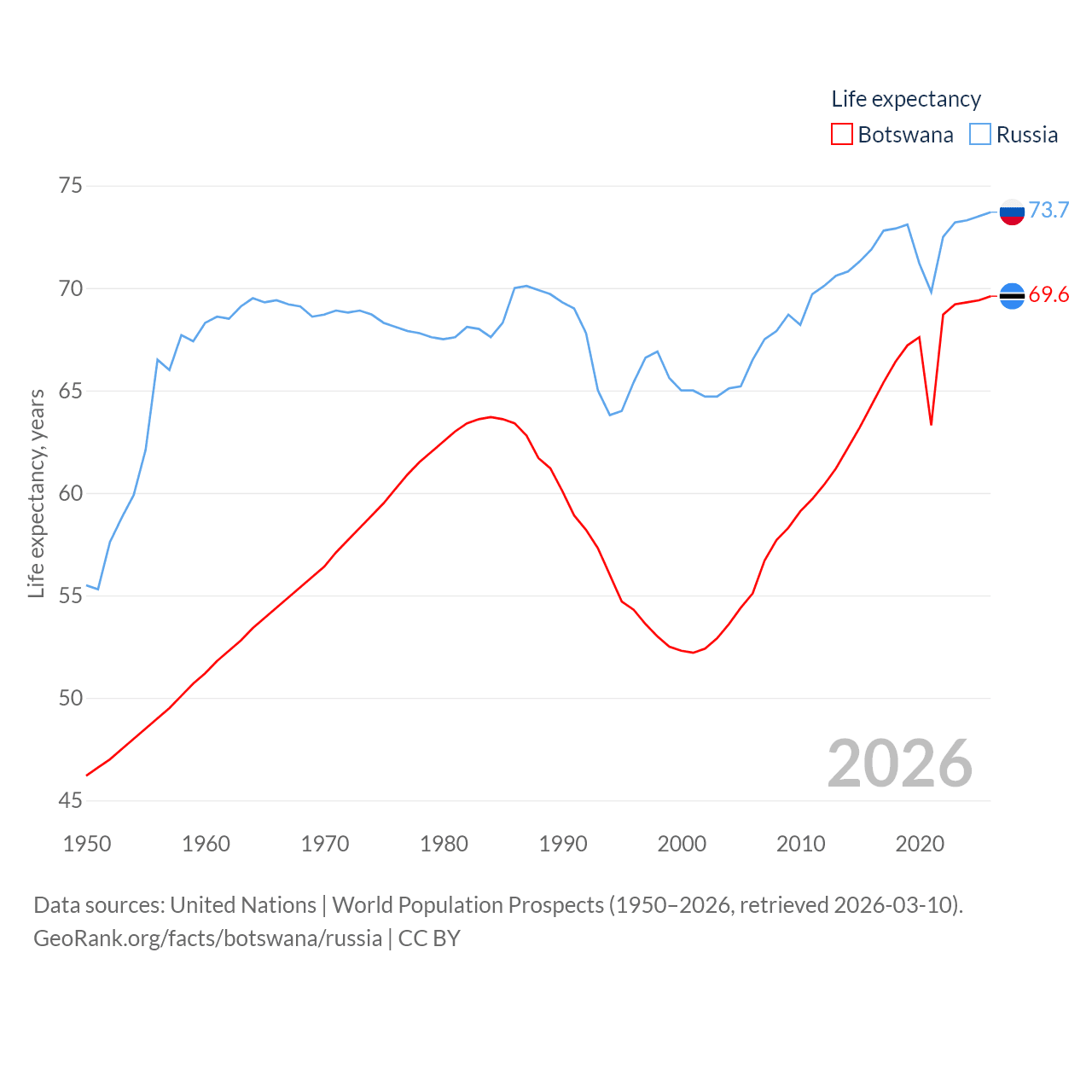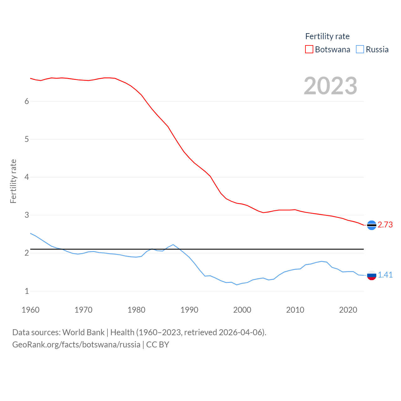 Botswana has a population of 2.52M (ranked 142/197), compared with 144M in Russia (ranked 9/197). Botswana's land area is 218,816 sq mi versus 6,323,145 sq mi for Russia (ranked 47th vs. 1st).